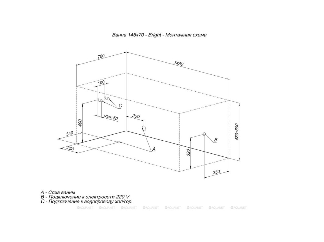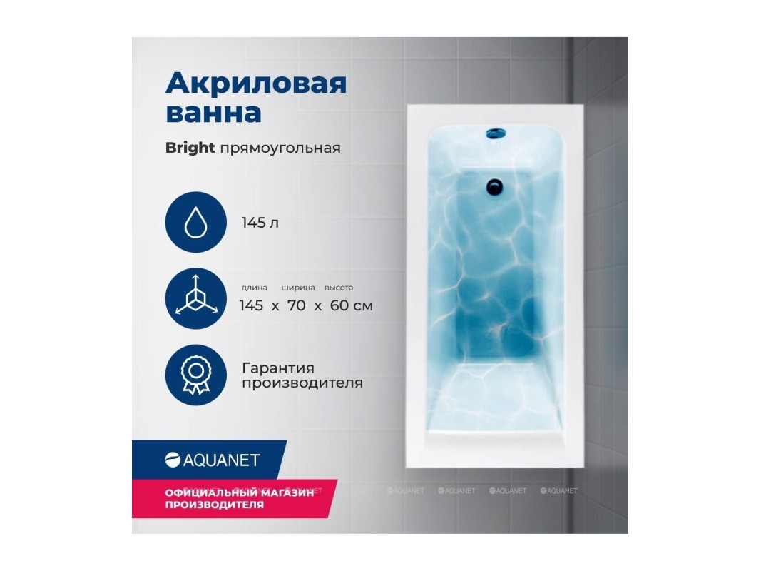 Акриловая ванна Aquanet Bright 145x70 создана с учетом растущего спроса на ванны простой прямоугольной формы в популярных размерах. Это модель с прямыми бортами и пологой спинкой, где соблюден идеальный угол для комфортного нахождения в ванне. Спинка плавно перетекает в бортик, поэтому релакс гарантирован даже без использования подголовника. Все линии ванны подчинены строгим законам эргономики. Ширина ванны 70 см при длине 145 см - это отличный вариант для крохотных ванных комнат. Чаша в этой ванне устроена таким образом, что для обозначенных размеров в ней достигнут максимально возможный внутренний объем, а именно 145 литров, и это при комфортной глубине в 413 мм от слива ванны до борта. Ванна рассчитана на нагрузку свыше 300 кг, так что даже крепкий мужчина сможет без опаски находиться в ней. Двойной слой армирования обеспечивает надежность чаши, а закладные из МДФ-плит в местах наибольшей нагрузки усиливают эффект.