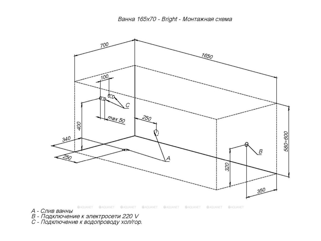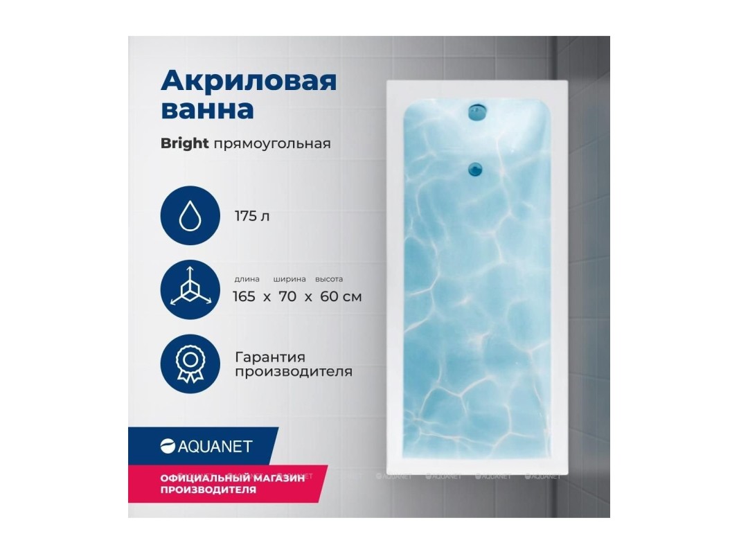 Акриловая ванна Aquanet Bright 165x70 создана с учетом растущего спроса на ванны простой прямоугольной формы в популярных размерах. Это модель с прямыми бортами и пологой спинкой, где соблюден идеальный угол для комфортного нахождения в ванне. Спинка плавно перетекает в бортик, поэтому релакс гарантирован даже без использования подголовника. Все линии ванны подчинены строгим законам эргономики. В современных условиях ширина ванны 70 см при длине 165 см - это наиболее востребованные габариты, так как прекрасно вписываются в стандартную планировку современных ванных комнат. Чаша в этой ванне устроена таким образом, что для обозначенных размеров в ней достигнут максимально возможный внутренний объем, а именно 175 литров, и это при комфортной глубине в 412 мм от слива ванны до борта. Ванна рассчитана на нагрузку свыше 300 кг, так что даже крепкий мужчина сможет без опаски находиться в ней. Двойной слой армирования обеспечивает надежность чаши, а закладные из МДФ-плит в местах наибольшей нагрузки усиливают эффект.