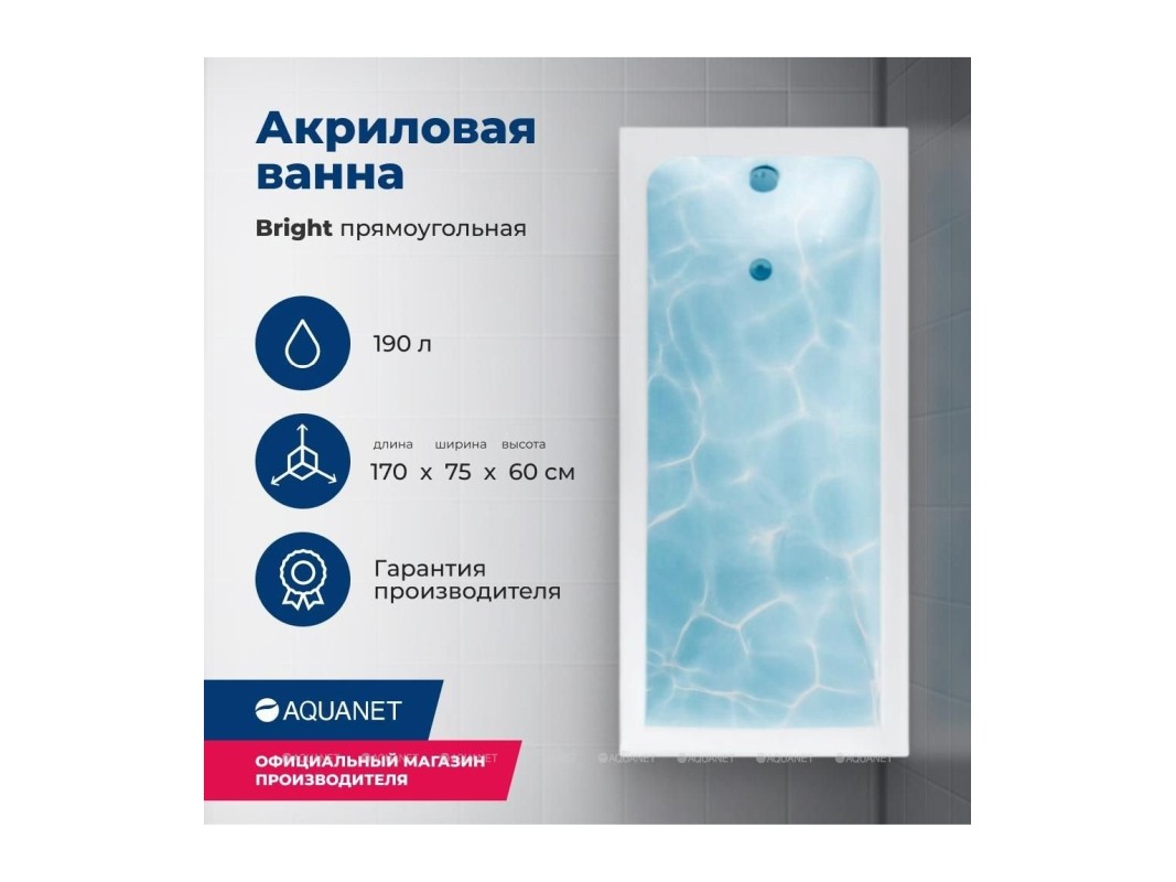 Акриловая ванна Aquanet Bright 170x75 создана с учетом растущего спроса на ванны простой прямоугольной формы в популярных размерах. Это модель с прямыми бортами и пологой спинкой, где соблюден идеальный угол для комфортного нахождения в ванне. Спинка плавно перетекает в бортик, поэтому релакс гарантирован даже без использования подголовника. Все линии ванны подчинены строгим законам эргономики. В современных условиях ширина ванны 75 см при длине 170 см - одно из популярных габаритов, так как прекрасно вписываются в стандартную планировку современных ванных комнат. Чаша в этой ванне устроена таким образом, что для обозначенных размеров в ней достигнут максимально возможный внутренний объем, а именно 190 литров, и это при комфортной глубине в 403 мм от слива ванны до борта. Ванна рассчитана на нагрузку свыше 300 кг, так что даже крепкий мужчина сможет без опаски находиться в ней. Двойной слой армирования обеспечивает надежность чаши, а закладные из МДФ-плит в местах наибольшей нагрузки усиливают эффект.