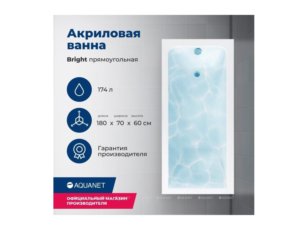 Акриловая ванна Aquanet Bright 180x70 создана с учетом растущего спроса на ванны простой прямоугольной формы в популярных размерах. Это модель с прямыми бортами и пологой спинкой, где соблюден идеальный угол для комфортного нахождения в ванне. Спинка плавно перетекает в бортик, поэтому релакс гарантирован даже без использования подголовника. Все линии ванны подчинены строгим законам эргономики. В современных условиях ширина ванны 70 см при длине 180 см - это наиболее востребованные габариты, так как прекрасно вписываются в стандартную планировку современных ванных комнат. Чаша в этой ванне устроена таким образом, что для обозначенных размеров в ней достигнут максимально возможный внутренний объем, а именно 174 литра, и это при комфортной глубине в 410 мм от слива ванны до борта. Ванна рассчитана на нагрузку свыше 300 кг, так что даже крепкий мужчина сможет без опаски находиться в ней. Двойной слой армирования обеспечивает надежность чаши, а закладные из МДФ-плит в местах наибольшей нагрузки усиливают эффект.