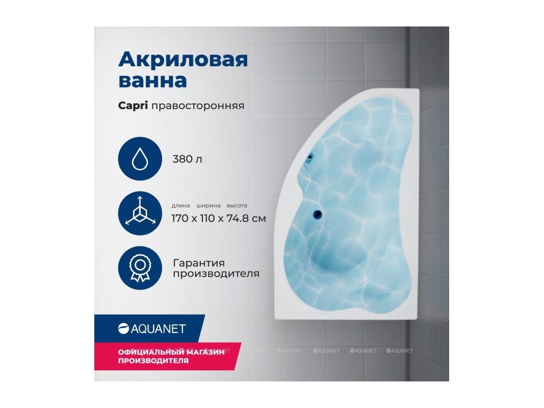 Компактная акриловая ванна Capri идеально подойдет для владельцев малогабаритных квартир. Даже в маленькой ванной комнате теперь можно устроить оазис безмятежности и умиротворения – Capri эффективно экономит пространство, обеспечивая максимальный комфорт на площади порядка 2-х квадратных метров. Плавные, округлые формы чаши со специальным углом наклона спинки для наибольшей релаксации мышц помогут вам отбросить все мысли и тревоги, ощутить, наконец, полное расслабление всего тела. Специальный выступ сформирован в виде сиденья – этот незаменимый элемент облегчит принятие душа для пожилых людей. Данная ванна изготовлена в правой ориентации. Благодаря свойствам акрила, такая ванна обладает высокой степенью гигиеничности – поверхность легко чистится, отсутствие микропор в материале делает его непроницаемым для бактерий. Кроме того, температура ванны из акрила соответствует температуре окружающей среды, поэтому вода в ней намного дольше остается горячей.