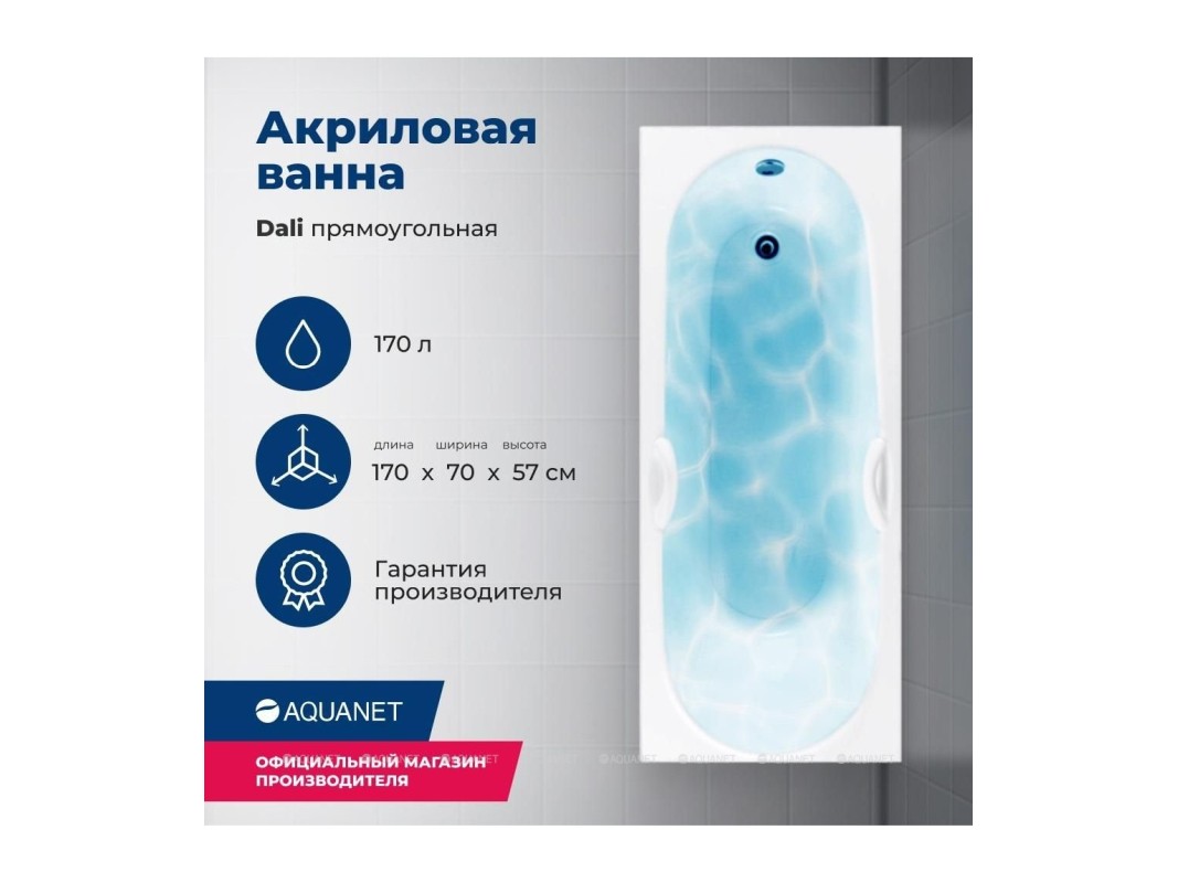 Акриловая ванна Aquanet Dali 170x70 отлично впишется в ванную комнату стандартной планировки. Именно поэтому модели длиной 170 см относятся к числу самых востребованных. Впрочем, ванна Dali не останется незамеченной и в больших помещениях, так как дизайн ее комфортной чаши необычайно привлекателен. Она напоминает купель, в которой так приятно отдохнуть и расслабиться, так как внутренняя форма ванн сделана с соблюдением всех правил эргономики и с учетом анатомических особенностей человеческого тела. Для этого в ванне предусмотрен удобный уклон спинки. Элегантные подлокотники придают своеобразие внешнему виду и являются еще одной деталью комфорта. Ванну при желании можно укомплектовать ручками в цвет изделия.