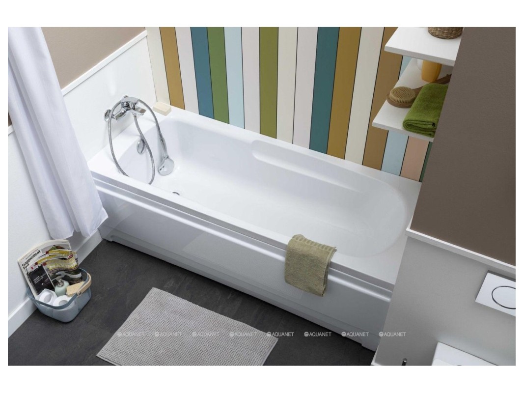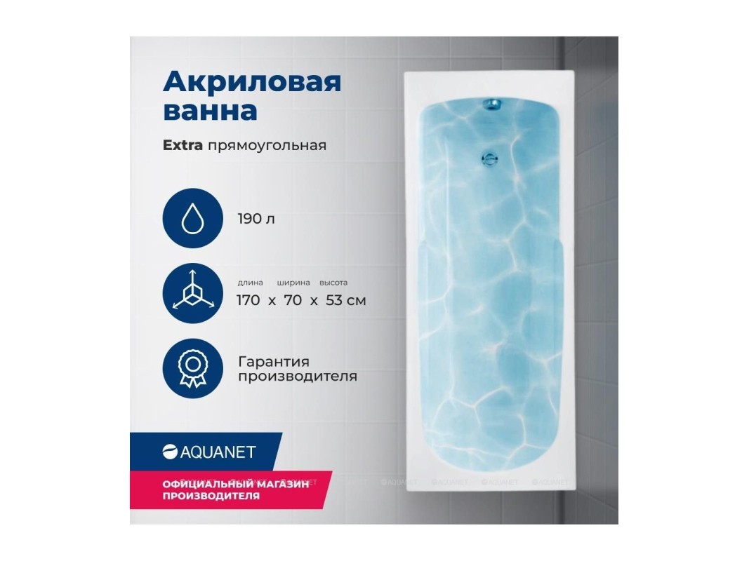 Акриловая ванна Aquanet Extra 170x70 может стать настоящей изюминкой ванной комнаты. И все благодаря элегантным линиям, более покатым у изголовья и резко очерченным – в изножье. Форма чаши содержит боковые детали, которыми удобно пользоваться как подлокотниками. Особенно актуально, если в семье есть дети и пожилые люди. Борт ванны со стороны изголовья сделан под углом, который соответствует принципам эргономики, а значит, находится в такой ванне – настоящий отдых для всего тела. Эксклюзивным для ванны Extra является и антискользящее покрытие. Оно похоже на застывшие на днище в виде ромбического узора маленькие круглые капельки воды. Для изготовления ванны использован сантехнический акрил толщиной 3 мм, а для усиления корпуса в местах наибольшей нагрузки установлены закладные из МДФ-плит и сделано двухслойное армирование стеклоровингом.