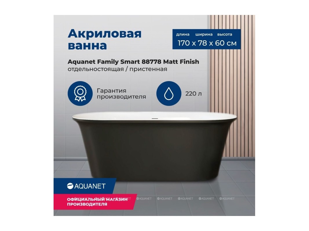 Акриловая ванна Aquanet Family Smart 88778 Matt Finish выполнена в современном стиле и отличается размером 170х78х60 см. Белая чаша глубиной 450 мм позволяет наливать до 220 л воды. Внешняя панель окрашена в черный матовый цвет (Black matte). Удобно располагающаяся спинка с округлым бортиком способствует комфорту и расслаблению мышц тела. В центральной части дна встроено отверстие для слива, на стенке — для перелива.