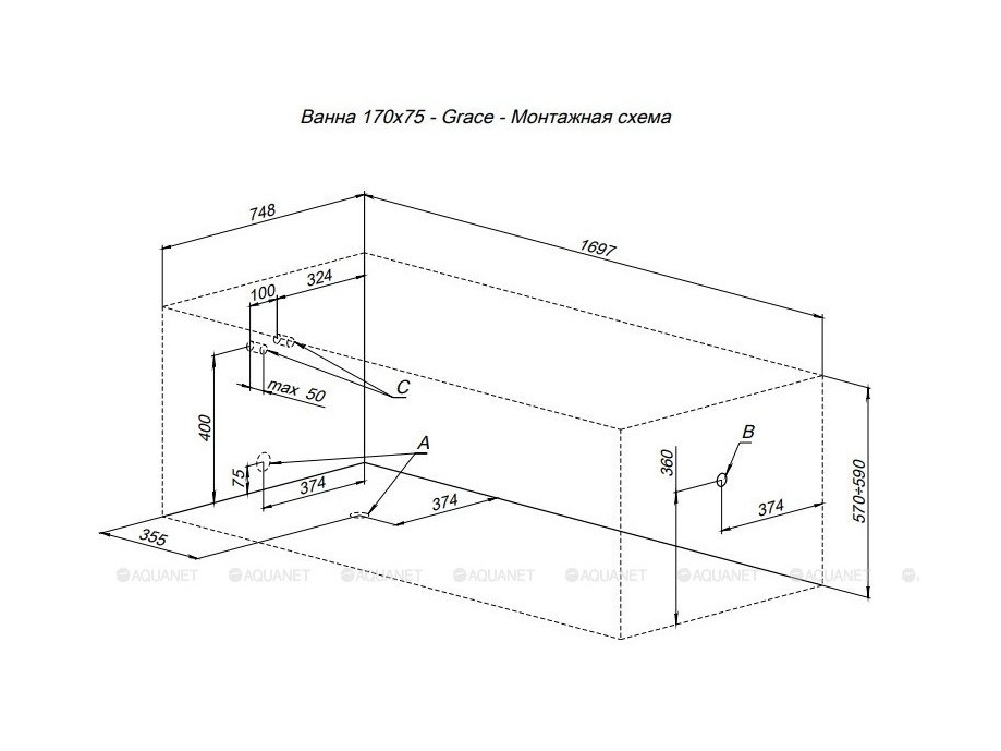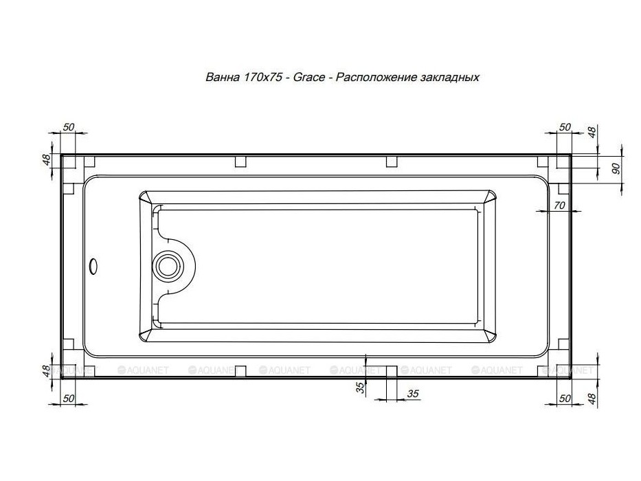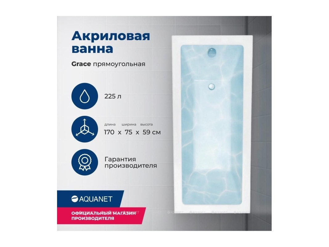 Акриловая ванна Aquanet Grace 170x75 классической прямоугольной формы отлично впишется в современный интерьер квартиры, загородного дома или гостиницы. Модель устанавливают вплотную к стене или в нишу. Материал изготовления — акрил, хорошо поглощающий звук и сохраняющий тепло. Для ухода не рекомендуется применять моющие средства, содержащие абразивные частицы. Длина составляет 170 см, ширина — 75 см. По периметру располагаются бортики, которые помогут подняться после водной процедуры или разместить шампунь, гель для душа и мочалку. Белоснежная чаша глубиной 432 мм позволяет набрать максимальное при таких параметрах корпуса количество воды — 220 л.