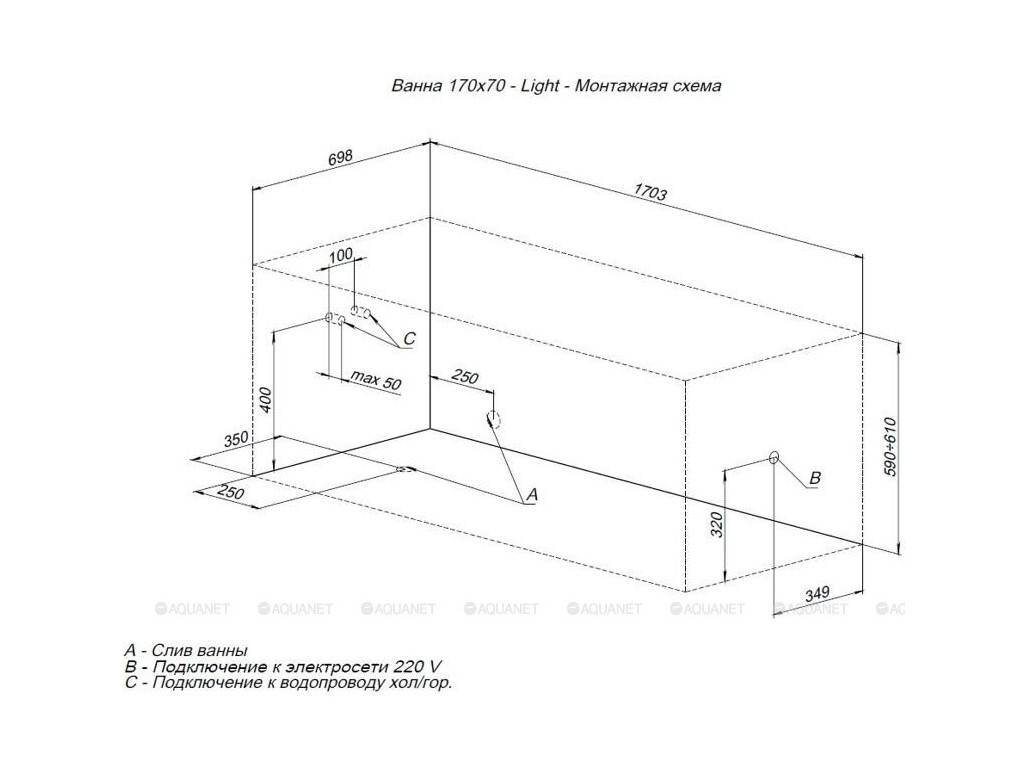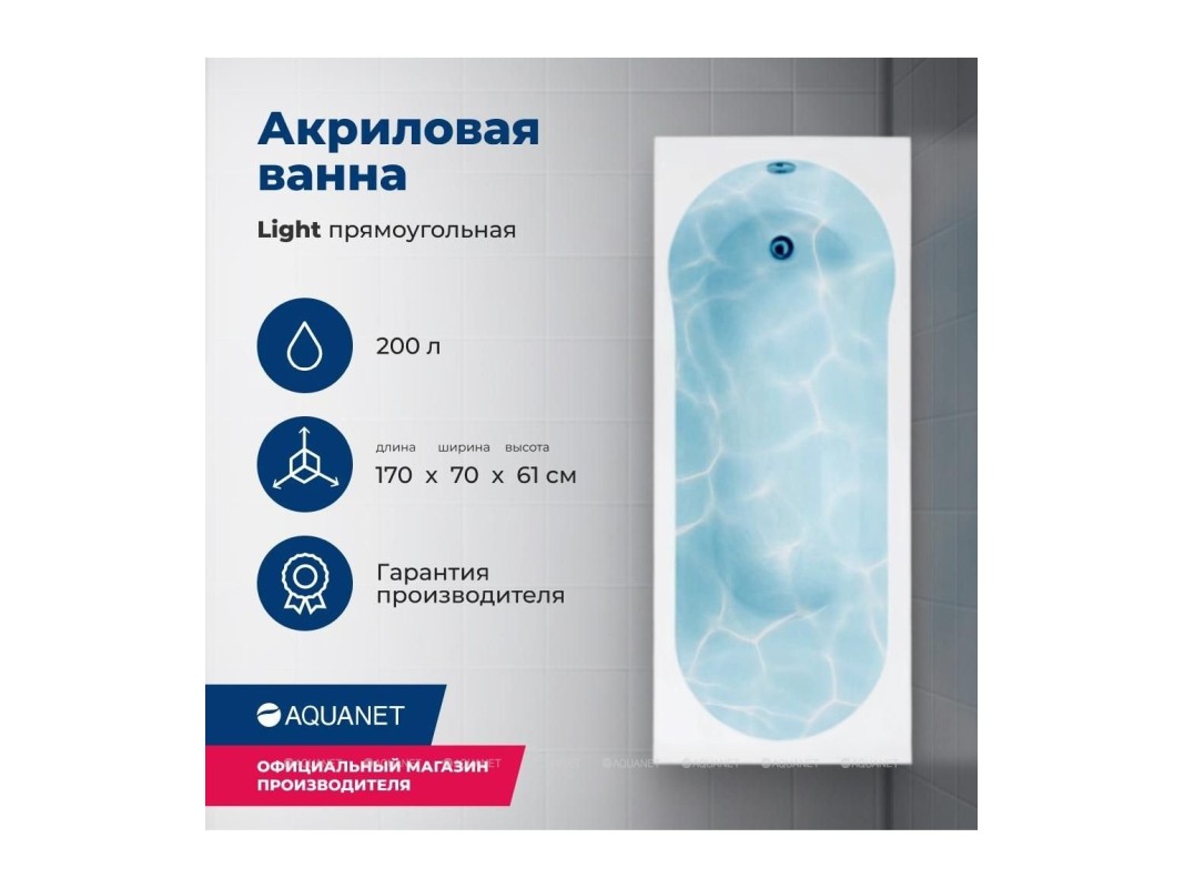 Акриловая ванна Aquanet Light 170x70 занимает особое место в ассортименте компании «Акванет», так как эффектно смотрится как в стандартной планировке, так и в большом помещении. У нее эргономичная чаша глубиной 380 мм и широкие борта. На них легко найти место для установки набортного смесителя – популярная в последнее время опция. А если установить на ванну еще и гидромассажное оборудование, аэромассаж и подсветку, то получится настоящий спа-комплекс на дому.