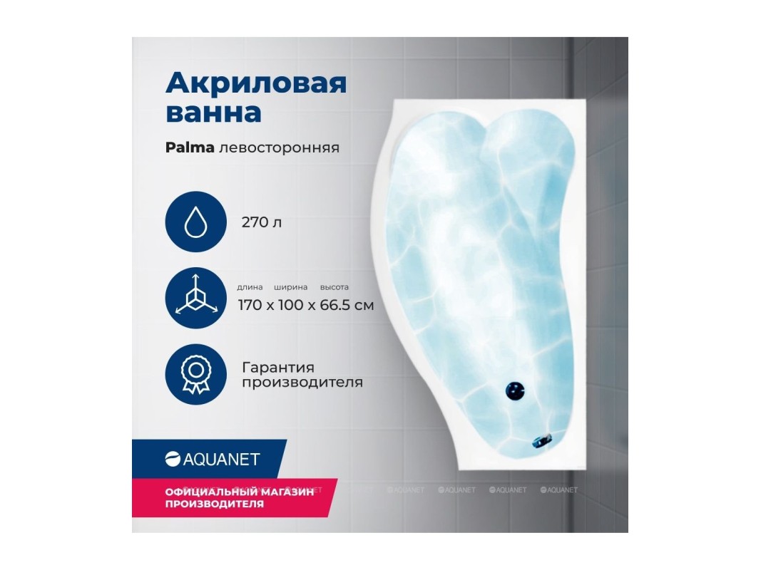 Акриловая ванна изящной формы Palma – само воплощение роскоши в мире неги и расслабления. Незабываемое ощущение комфорта, которое способна подарить ванна Palma, останется с вами на весь день, наполнит энергией мышцы, поможет справиться со стрессом и негативными воздействиями окружающей среды. Плавные линии, мягкие формы, изгибы и аккуратные выступы — прообраз природных мотивов, наполняющий ванную комнату спокойствием, уединением. Угловая часть чаши образует собой полноценное душевое сиденье с бортами - незаменимый элемент для пожилых людей и людей с ограниченными возможностями. Данная ванна может быть изготовлена как в правой, так и в левой ориентации.
