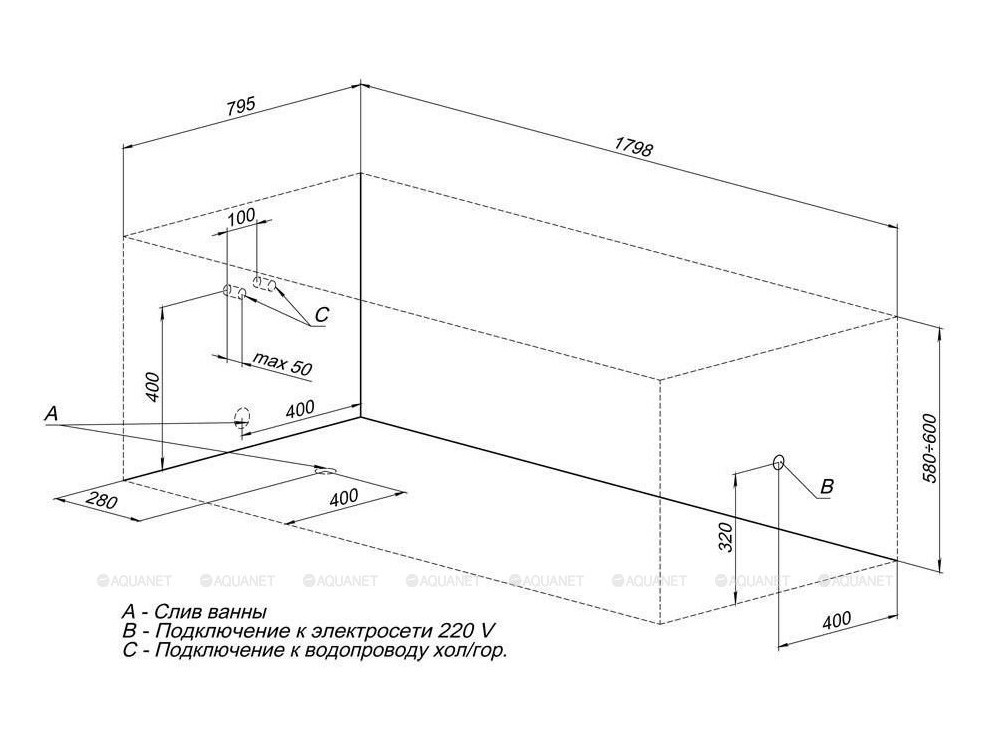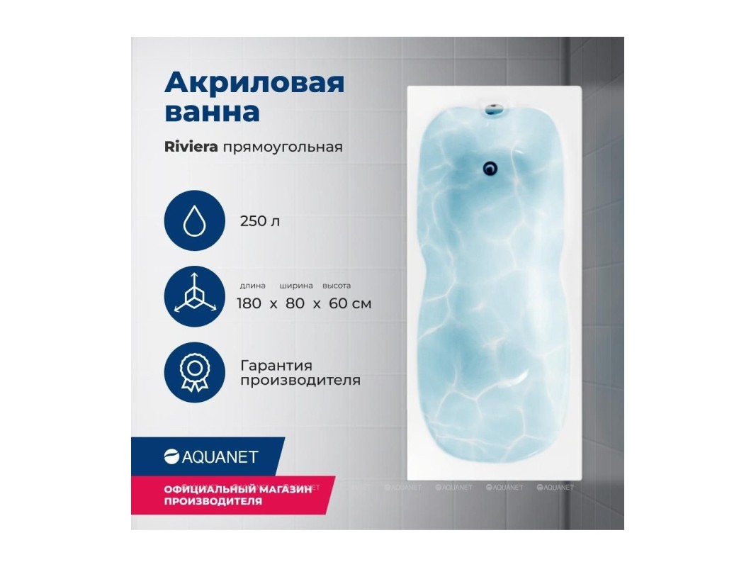 Акриловая ванна Aquanet Riviera 180x80 в одном из самых востребованных размерах выполнена в классической прямоугольной форме и имеет очень комфортную чашу в виде песочных часов. В такой ванне можно погрузиться в релакс, почувствовав себя хоть ненадолго на Ривьере. Способствует тому и гладкий, способный долго сохранять тепло материал, и удобная форма ванны, и вполне комфортная глубина – 408 мм. Объем ванны в 250 литров достаточен для того, чтобы человеку среднего роста и средних габаритов полностью погрузить в ванну тело, не испытывая неудобств. Ванна выполнена из современного инновационного материала, соединившего АБС и ПММА, произведенного в Ирландии. Основа его – акрил, но не литьевой, который при довольно высокой стоимости имеет определенные ограничения при производстве изделий из него и дальнейшей их эксплуатации. Современный материал имеет все достоинства акрила с добавлением прочностных характеристик АБС. Ванна обладает улучшенными характеристиками по прочности и эластичности по сравнению с изделиями из литьевого акрила.