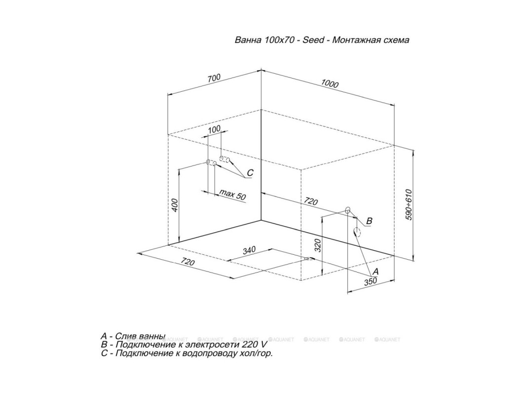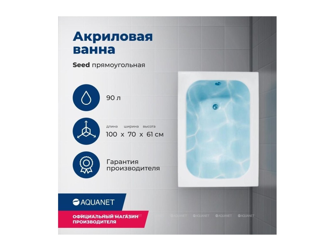 Акриловая ванна Aquanet Seed 100x70 - суперкомпактная модель, которая поместится даже в самом скромном по размерам помещении. В ширину она 70 см, а вот длину имеет необычно маленькую – всего 100 см. Принимать ванну взрослому человеку в ней можно только сидя. Впрочем, даже в таком положении при глубине 385 мм от слива ванны до борта в нее можно погрузиться всем телом. В ванну входит 90 литров воды. Маленькая ванна Seed по качеству не уступает своим более габаритным собратьям. Она сформована из сантехнического акрила европейского производства, покрыта для прочности двойным слоем стеклоровинга с установкой в местах наибольшей нагрузки закладных из МДФ-плиты. У нее широкие борта, которые подойдут для установки каскадного смесителя или которые можно использовать в качестве полочки для гигиенических средств. А поверхность чаши белоснежная и глянцевая, приятная на ощупь.