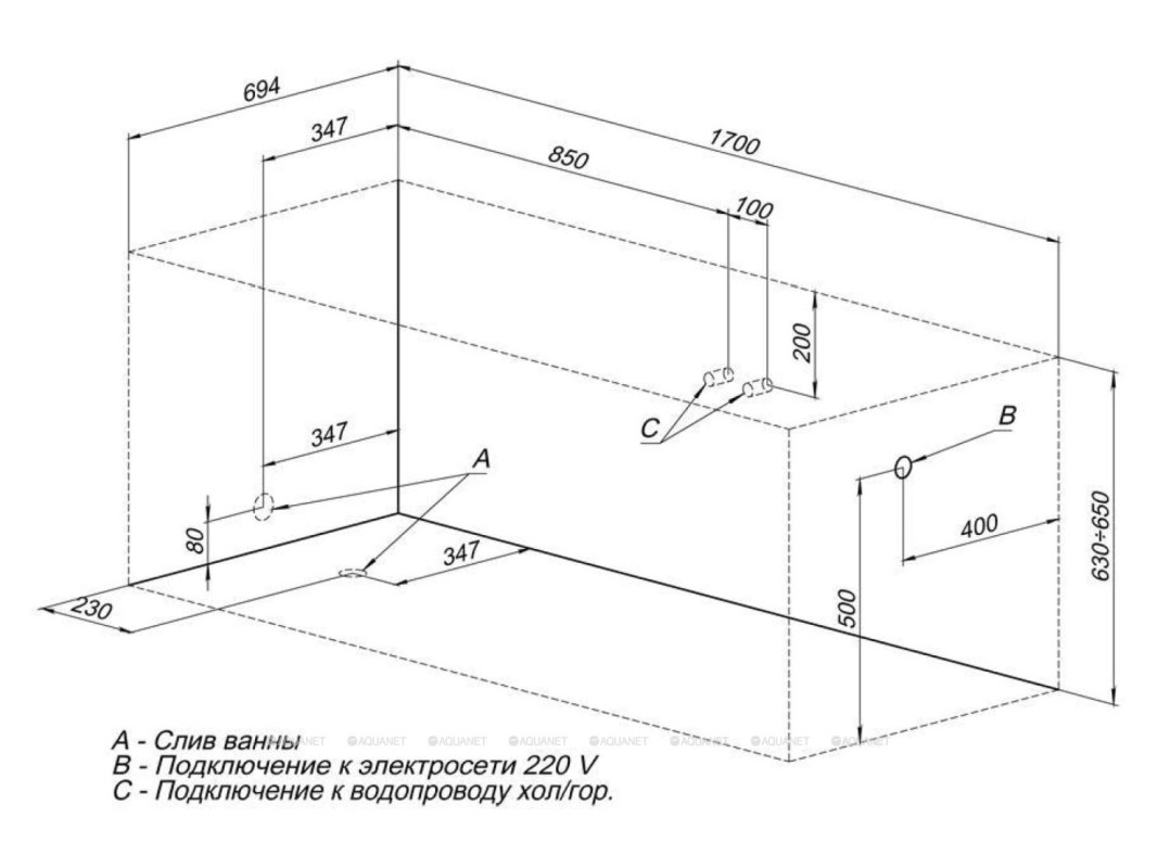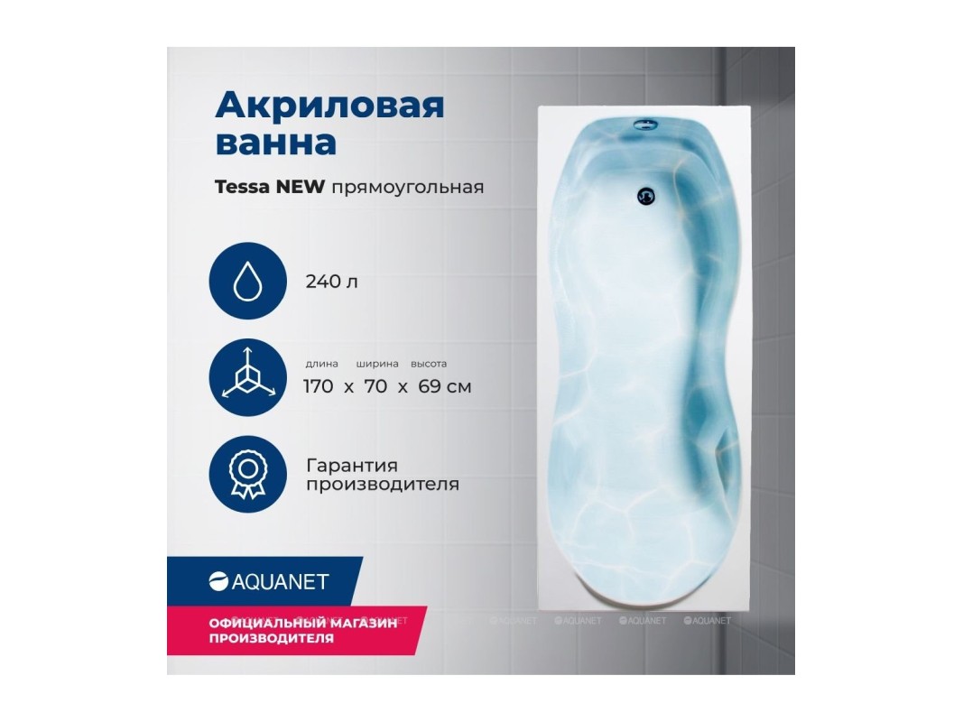 Акриловая ванна Aquanet Tessa имеет прямоугольную форму стандартных параметров 170х70, но внутренние параметры ванны сложны и необычны. Несмотря на небольшой объем входящей в ванну Tessa воды (235 литров), она имеет приличную глубину 440 мм от слива ванны до борта, что позволит окунуться в воду всем телом. Внутри чаши ванны предусмотрен маленький порожек под переливом, фигурные подлокотники и удобный выступ для удобного размещения головы. Ванна изготовлена из сантехнического акрила. Этот материал хорош тем, что изделия из него долго держат тепло, что в случае с ванной особенно актуально, так как нежиться в теплой воде можно достаточно долго – она не остынет. Кроме того, сантехнический акрил – непористый материал, поэтому он такой гладкий и блестящий, а грязь на нем не задерживается. Несмотря на причудливые формы чаши ванны Tessa стереть с него пену легко и просто обычной намыленной мягкой тряпочкой: под потоком воды она сама смоется.
