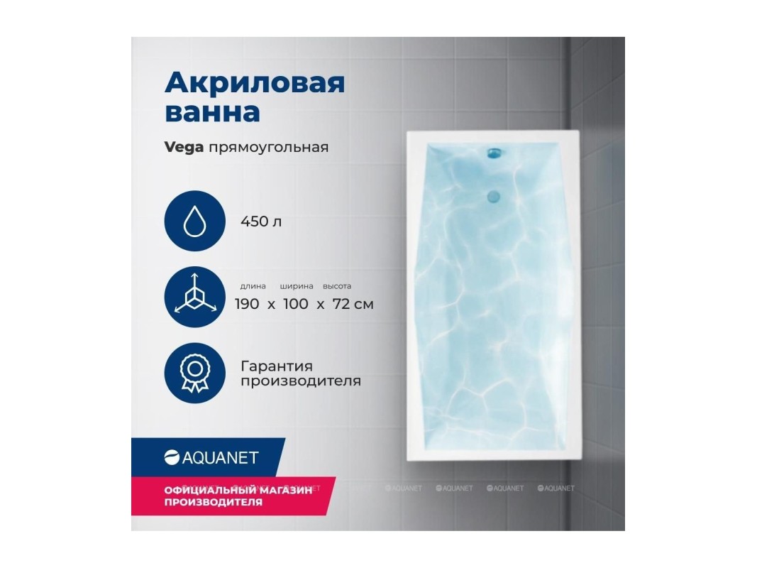 Вместительная акриловая ванна 190х100 Vega станет вашим любимым местом проведения досуга. Увеличенные габариты чаши позволят с комфортом насладиться принятием горячей расслабляющей ванны даже вдвоем, в такой ванной без преувеличения можно почувствовать себя как в бассейне. Прямоугольная форма позволит гармонично вписать эту модель как в классический, так и современный интерьер. Особые свойства акрила делают его идеальным материалом для изготовления ванн: он прочен, прост в уходе, непроницаем для бактерий, легко ремонтируется, поверхность чаши менее скользкая по сравнению с чугунными аналогами. Еще одно важное преимущество акриловой ванны заключается в ее теплоемкости: вода здесь намного дольше остается горячей.