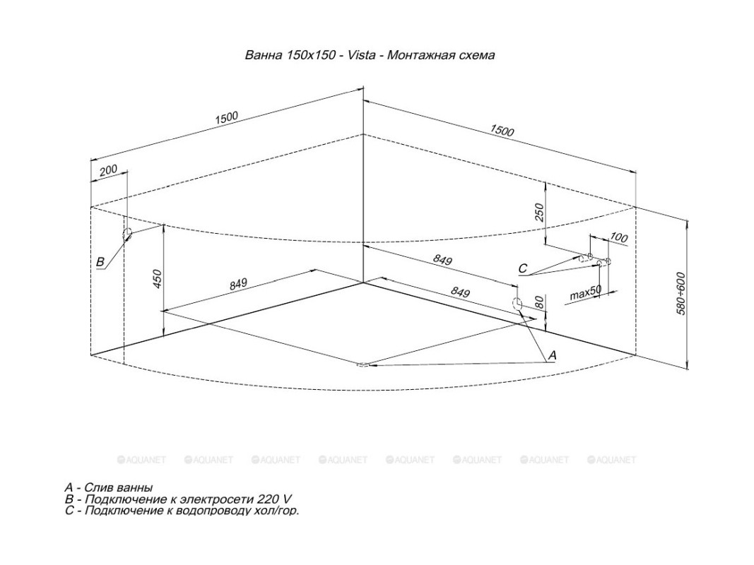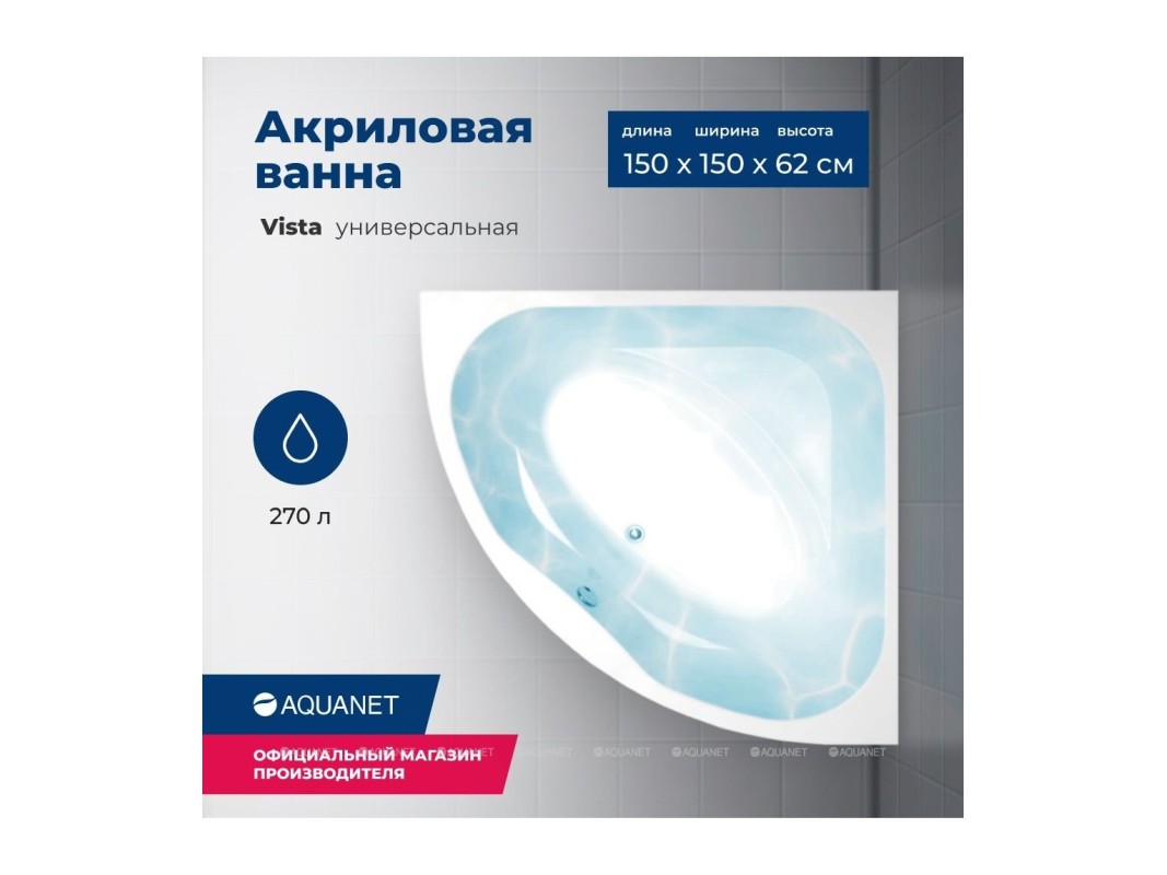 Акриловая ванна Aquanet Vista 150x150 обладает идеальными формами с открытыми чистыми линиями. Чаша спроектирована таким образом, чтобы вмещать в себя максимальное количество воды, возможное при размерах 150х150 см. Объем входящей в нее воды составляет 270 литров. Ванна предполагает угловую установку и рассчитана на довольно просторное помещение ванной комнаты. Внутри чаши заложено довольно большое сидение, где также можно разместить пеномоющие средства и использовать ее как полочку. Изделие выполнено из сантехнического акрила с двойным слоем стеклоровинга снаружи, что гарантирует ей надежность. Она способна выдержать сидящего в воде человека весом не менее 300 кг, так что без опаски там можно находиться вдвоем. Бортики ванны достаточно широкие, что позволяет установить на любой из сторон набортный смеситель. Белоснежная глянцевая поверхность будет долго оставаться идеальной при правильном уходе.