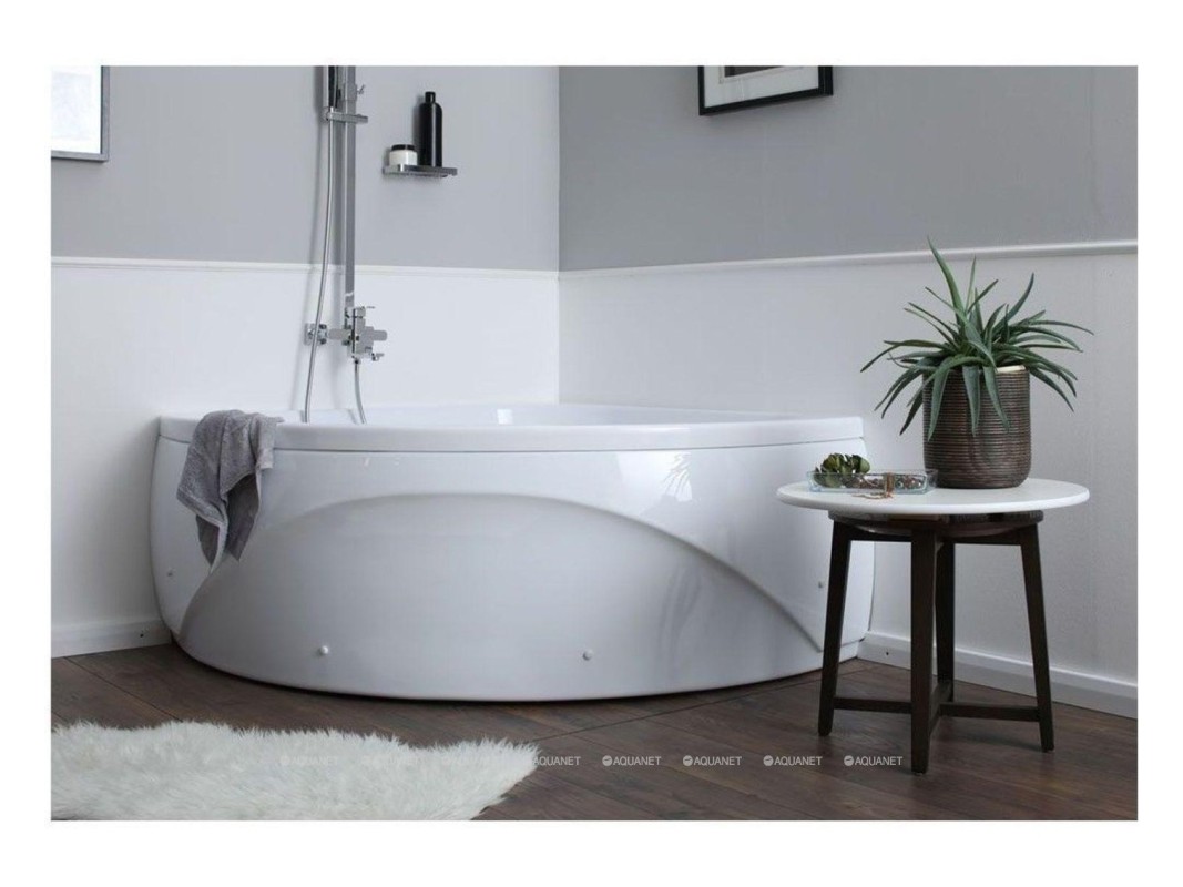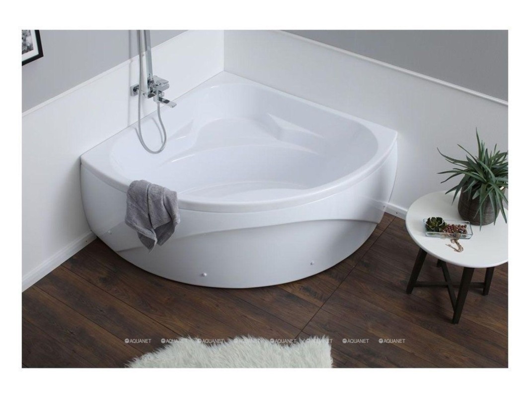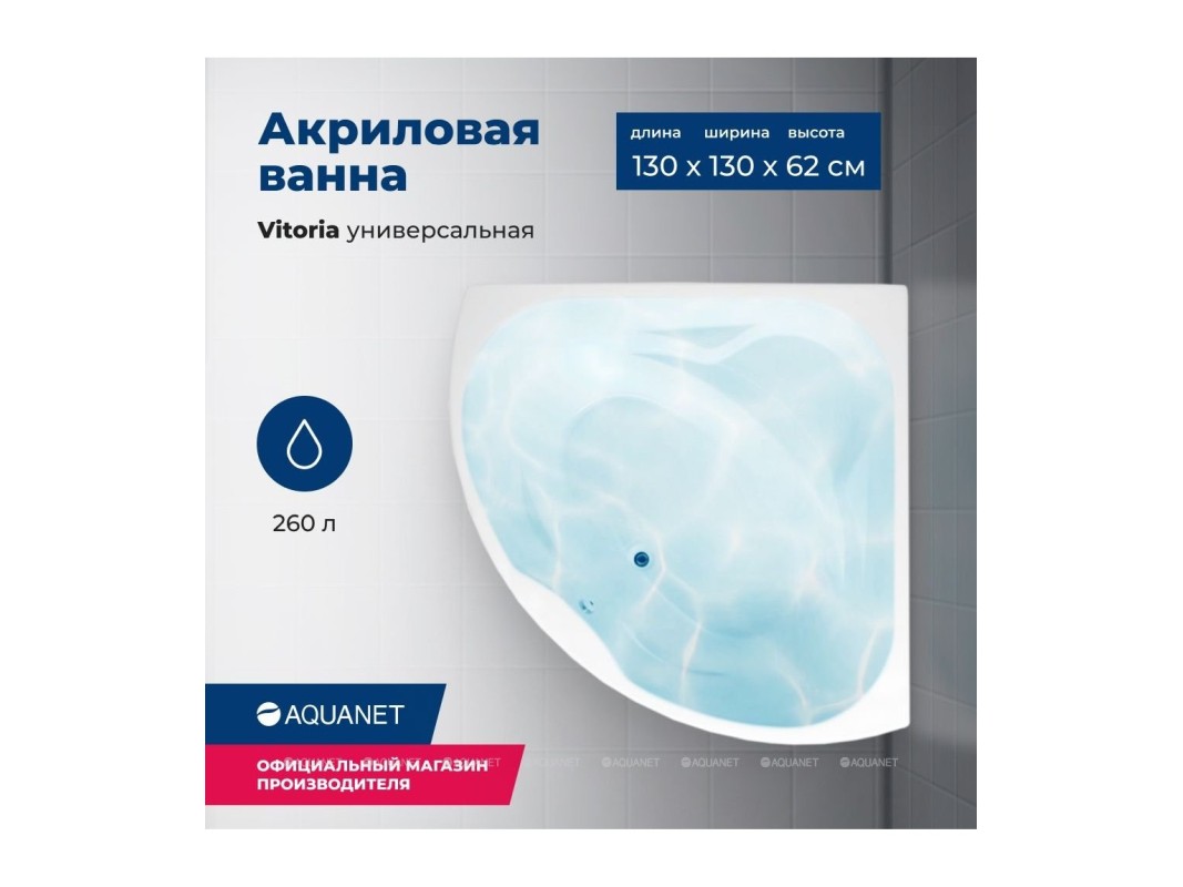 Угловая ванна Aquanet Vitoria 135x135, без гидромассажа. Глянцевая белоснежная поверхность акриловой ванны вызывает восхищение и желание прикоснуться. Материал обладает теплоемкостью и антибактериальными свойствами и устойчив к появлению внешних дефектов. Ванна усилена двойным составом стекловолокна и полиэфирной смолы, в местах нагрузки имеется дополнительное укрепление в виде закладных из МДФ-плиты.