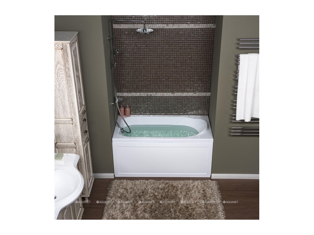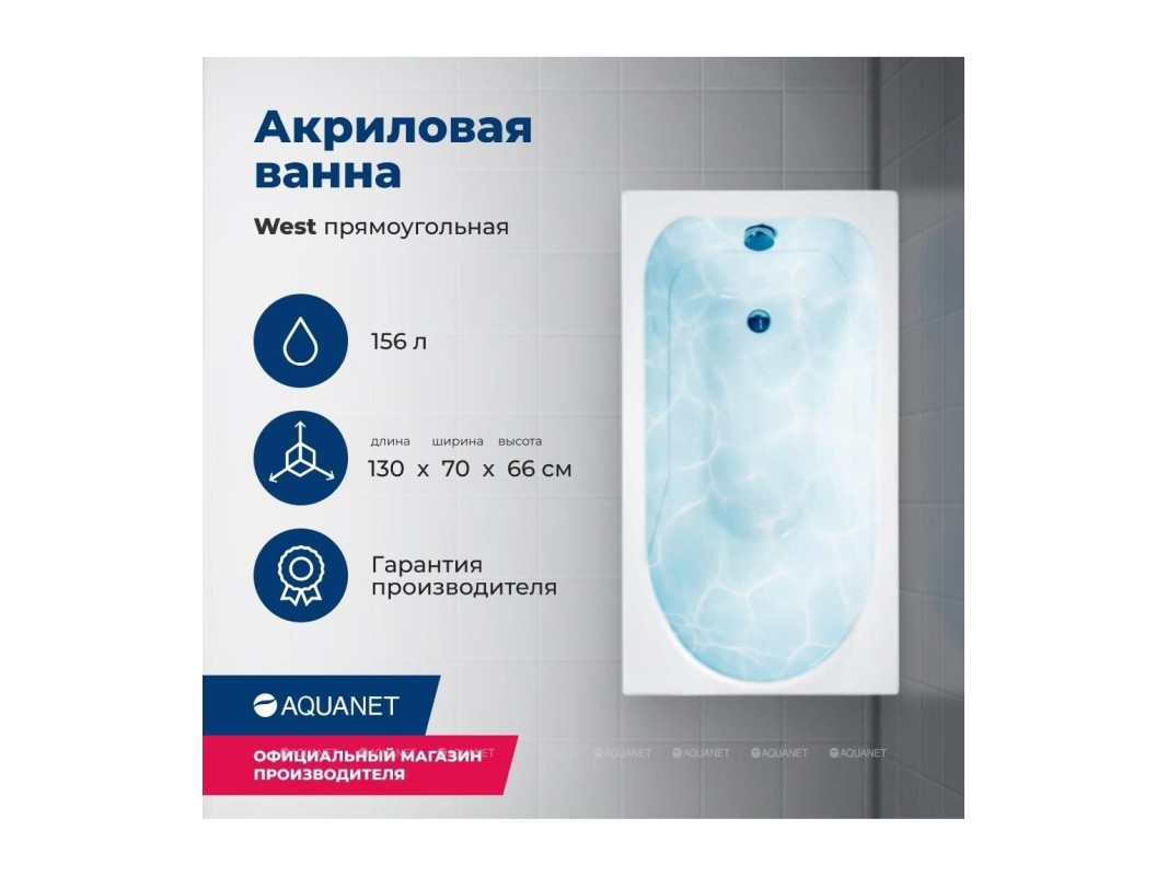 Акриловая ванна Aquanet West 130x70 — прекрасный выбор модели эконом-класса. На первый взгляд она напоминает своей формой модели Nord. Тот же эргономичный силуэт с рассчитанным углом наклона задней стенки, которая позволяет удобно расположиться в ней даже человеку высокого роста. Тот же специальный выступ для подголовника, те же компактные площадки по углам ванны, которые можно приспособить под размещение банных принадлежностей. И та же белоснежная поверхность сантехакрила, которая роднит все ванны Aquanet. И все же разница есть. Она дешевле. Причем, на низкую цену повлияли вполне объективные вещи. Так, для изготовления ванны West использован акрил толщиной 4 мм, что всего на 1 мм меньше, чем остальные модели. Также ее глубина на 5 см меньше, чем у ближайших родственников из коллекции Nord.