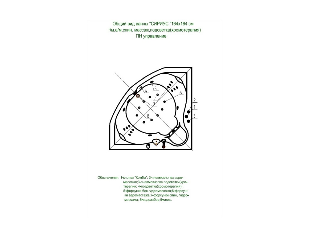 На сегодняшний день угловая ванна Сириус — самая большая модель в нашем ассортименте (164х164 см). Если Вы хотите сэкономить пространство помещения не теряя в объеме воды — это, несомненно, Ваш выбор. На бортах для удобства можно разместить необходимые принадлежности. Также можете принимать гидромассажные процедуры для ног, сидя на специальном сиденье.