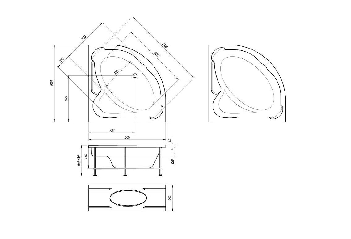 Ванна имеет размеры 150x150см и внушительный объем – 260л, подходит для комфортного купания вдвоем. Корпус оснащен двумя удобными спинками со встроенными подголовниками. Угловое глубокое сидение предназначено для душа и косметических процедур. Слив ванны расположен посередине. Если установить смеситель по центру, то регулировать воду можно одним движением руки, не меняя положения.