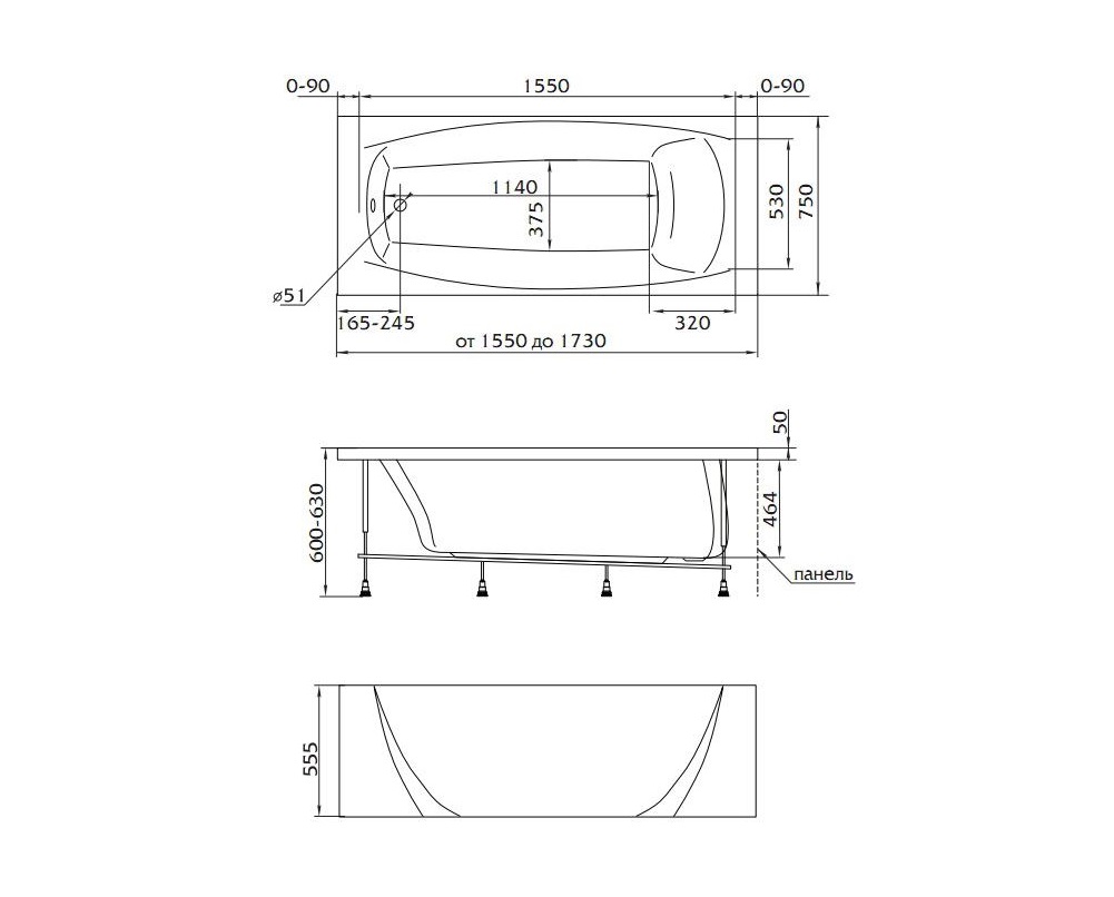 - Акриловая ванна MarkaOne Pragmatika 173х75 с возможностью изменения размера до 155х75