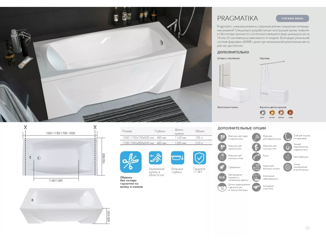 Прямоугольная ванна Pragmatika – первая отрезная ванна в России, которую можно уменьшить на 18 см без какой-либо потери качества, функциональности и эстетики. Она является уникальной разработкой конструкторско-технологического отдела компании 1Марка и станет превосходным решением в случае, если для ванной комнаты ввиду ее особенностей крайне сложно подобрать стандартную модель ванной.