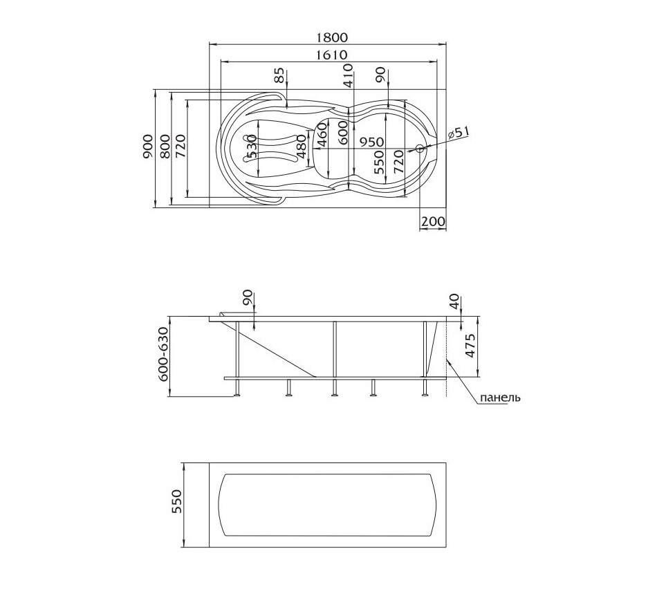 В этой ванне можно полностью расслабиться и получить максимальное удовольствие от длительных водных процедур. А благодаря габаритам корпуса – 180x90x63см в ней будет комфортно обладателям любого роста. Оригинальное дизайнерское решение прямоугольной формы и плавных изящных линий отлично сочетается с любым стилем в интерьере ванной комнаты.