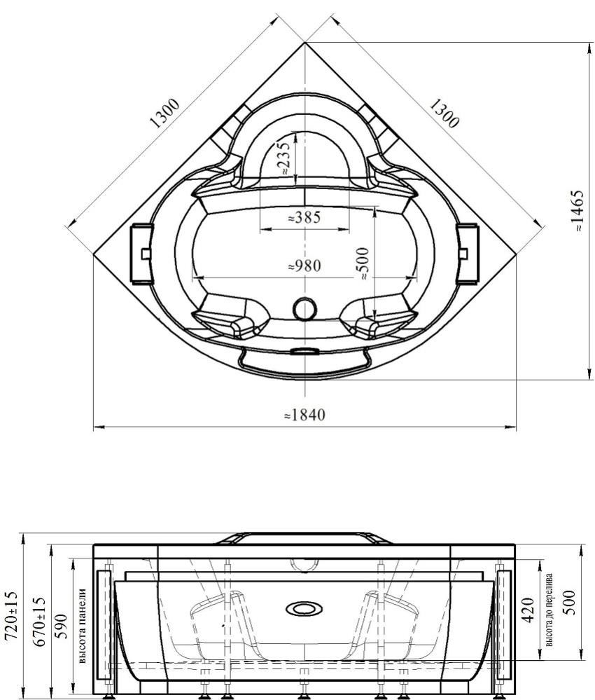 Угловая симметричная ванна «Сорренто» 130х130 отличается более компактными размерами и подходит для небольшой ванной комнаты. Ванна устанавливается в угол, имеет две одинаковые стороны и изящно скругленную третью, за счет чего отлично вписывается в интерьер. Несмотря на сокращенные габариты, купель обладает глубиной 500 мм и рассчитана на объем 300 л.