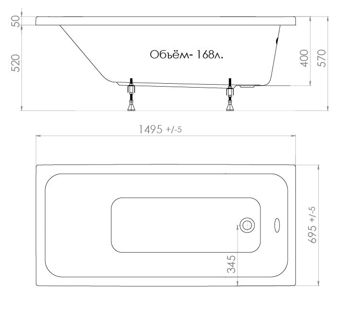 Для облегчения монтажа ванны в ограниченном пространстве ванной комнаты и в соответствии с ТУ, размеры изделия могут отличаться, по габаритной длине: -1%+0,2%, по габаритной ширине: -2%+0,2%