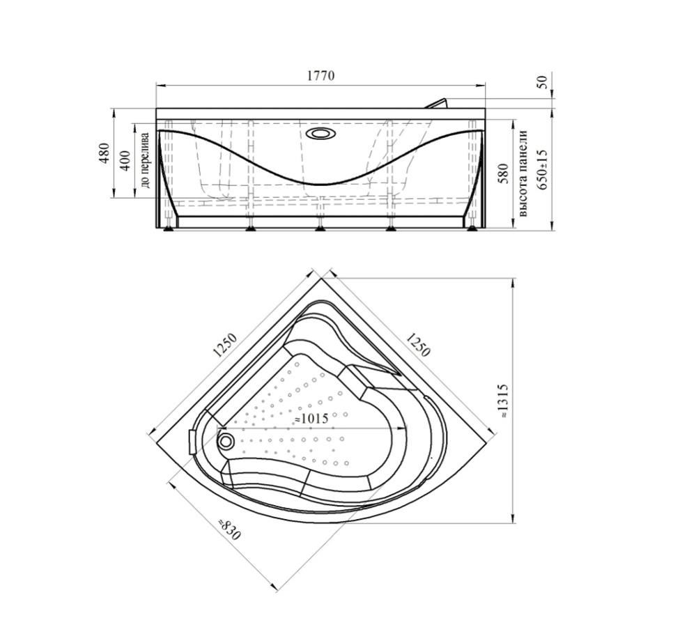 Равносторонняя угловая модель имеет внешние компактные габариты 1250х1250х650 мм с увеличенным внутренним пространством 1015х830 мм.