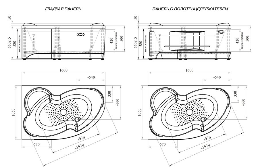 Фронтальная панель на ванну Ирма 160х105 выпускается в двух вариантах. Первый вид – это акриловая панель, в центре которой есть углубление в виде полочки с полотенцедержателем и по бокам она украшается стразами или мозаикой. Второй вид отличается своим лаконичным дизайном. На панелях отсутствуют ложементы для установки страз и мозаики. В нижней части расположено углубление, предназначенное для удобства подхода к ванне.