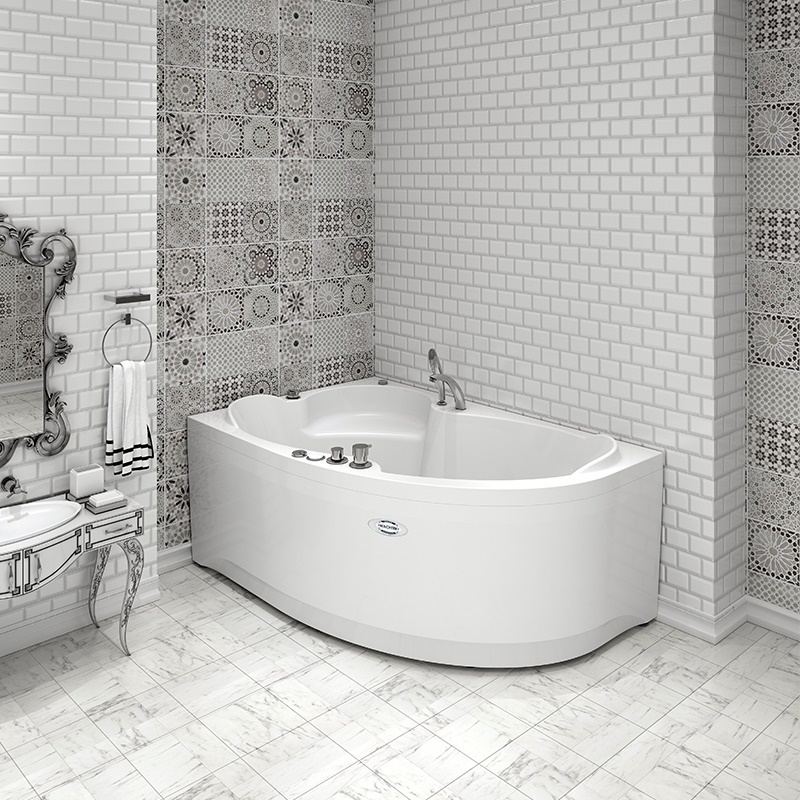 Угловая форма ванны Ирма экономично использует пространство ванной комнаты