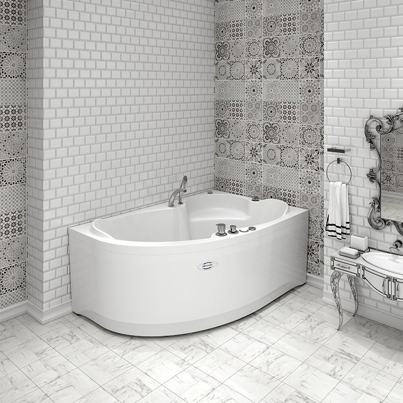 Угловая форма ванны Ирма экономично использует пространство ванной комнаты