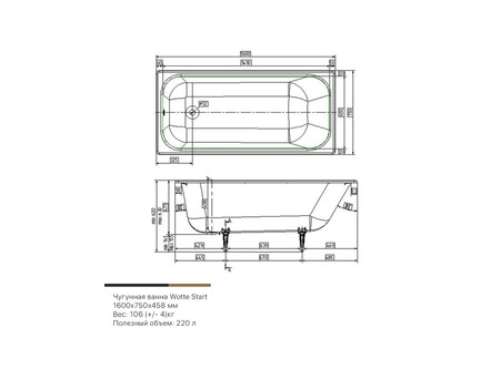 Чугунная ванна Wotte Start, c Отверстиями для Ручек, 160х75 БП-00000002