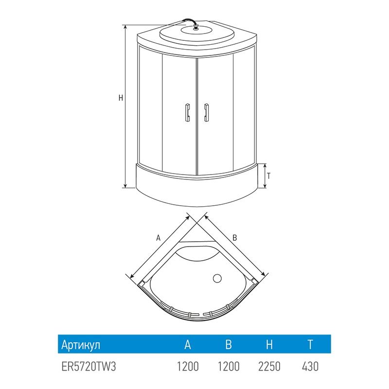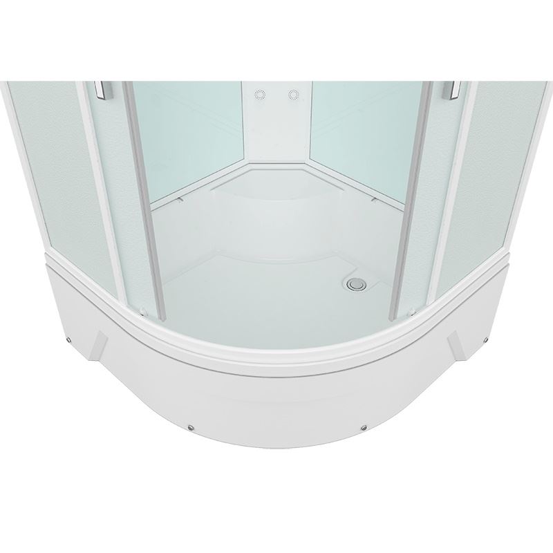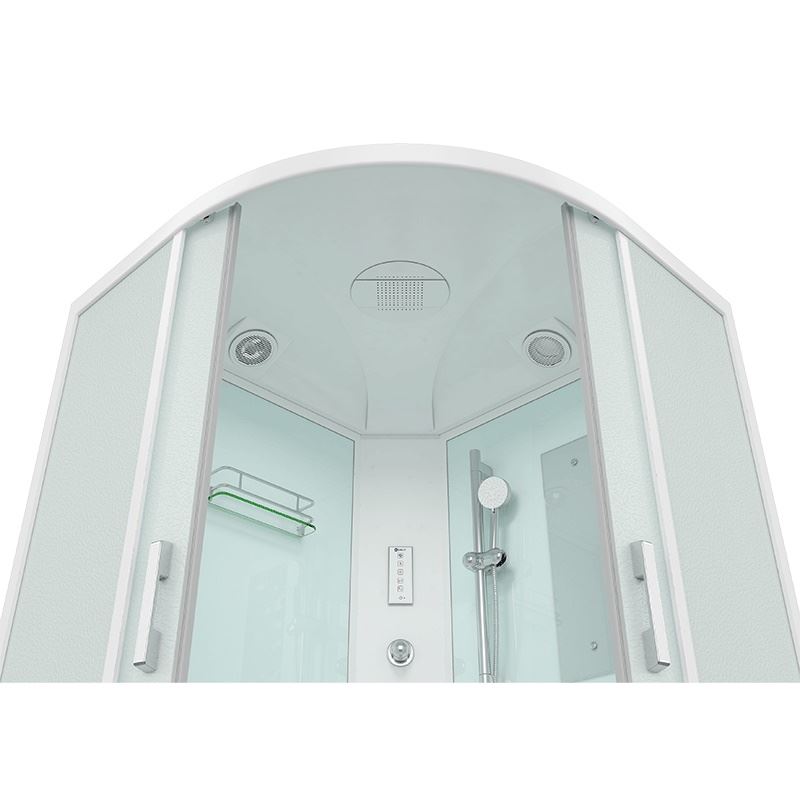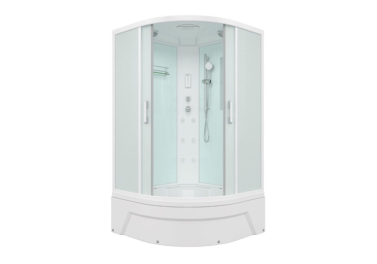 тропический душ, ручной душ 3х режимный, гидромассаж (кол-во форсунок 6 шт), верхний свет, сенсорный пульт, FM- радио, вентилятор, зеркало, полочка, рейлинг для душ-лейки.