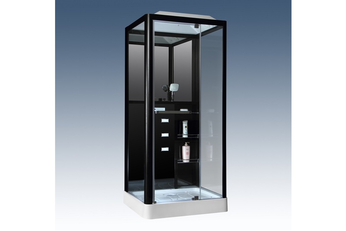 Алюминиевая рама, Закаленное стекло 6мм, управляется сенсорной панелью, радио, вентилятор, светильник, полка, смеситель 3 режимный кран, массаж ног, крыша с верхним душем, ручная лейка.