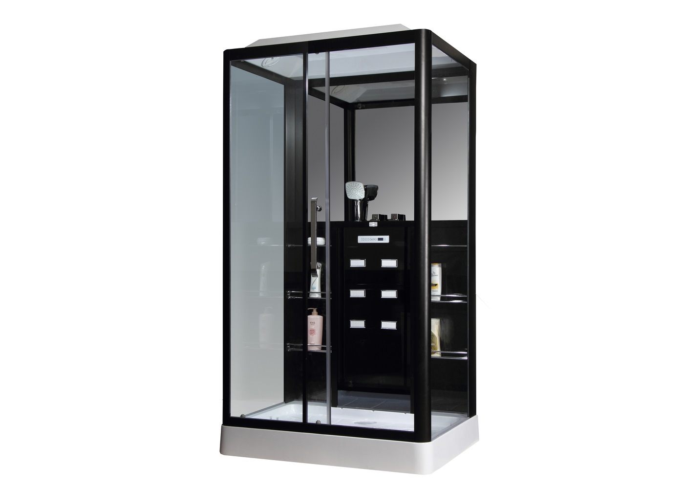 Алюминиевая рама, Закаленное стекло 6мм, управляется сенсорной панелью, радио, вентилятор, светильник, полка, смеситель 3 режимный кран, массаж ног, крыша с верхним душем, ручная лейка.