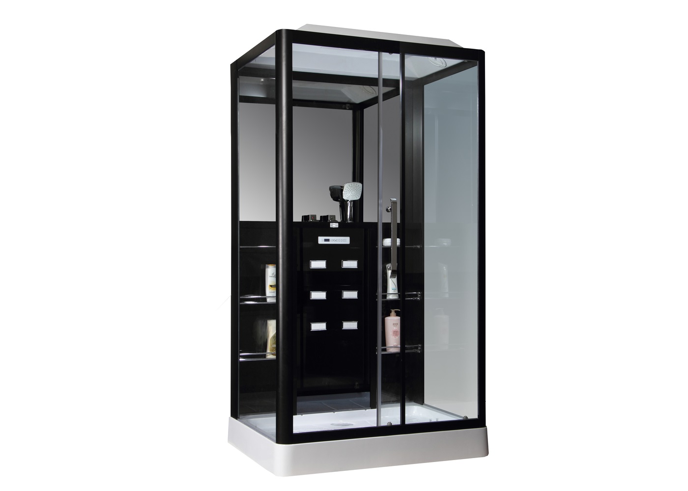 Алюминиевая рама, Закаленное стекло 6мм, управляется сенсорной панелью, радио, вентилятор, светильник, полка, смеситель 3 режимный кран, массаж ног, крыша с верхним душем, ручная лейка.