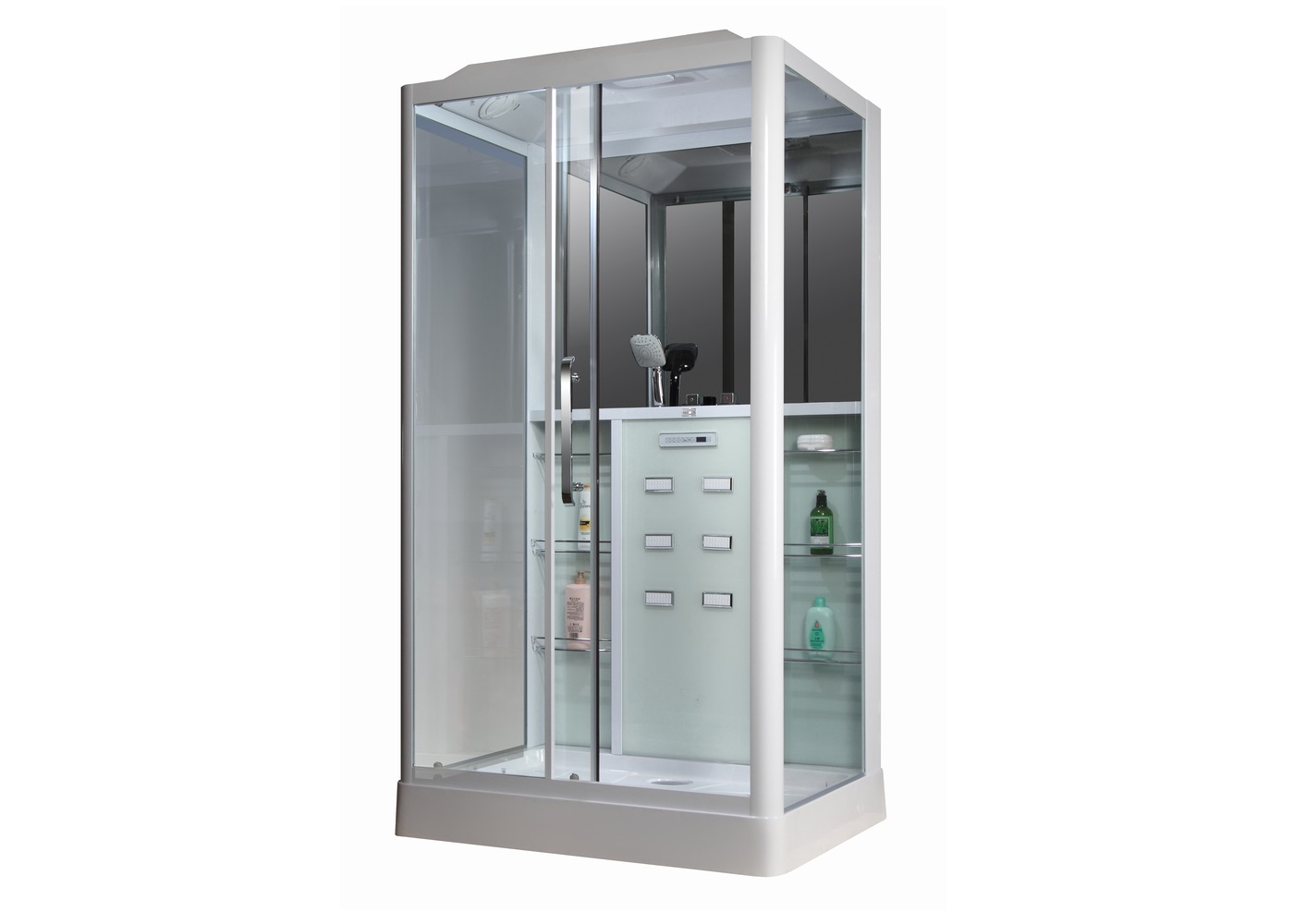 Алюминиевая рама, Закаленное стекло 6мм, управляется сенсорной панелью, радио, вентилятор, светильник, полка, смеситель 3 режимный кран, массаж ног, крыша с верхним душем, ручная лейка.