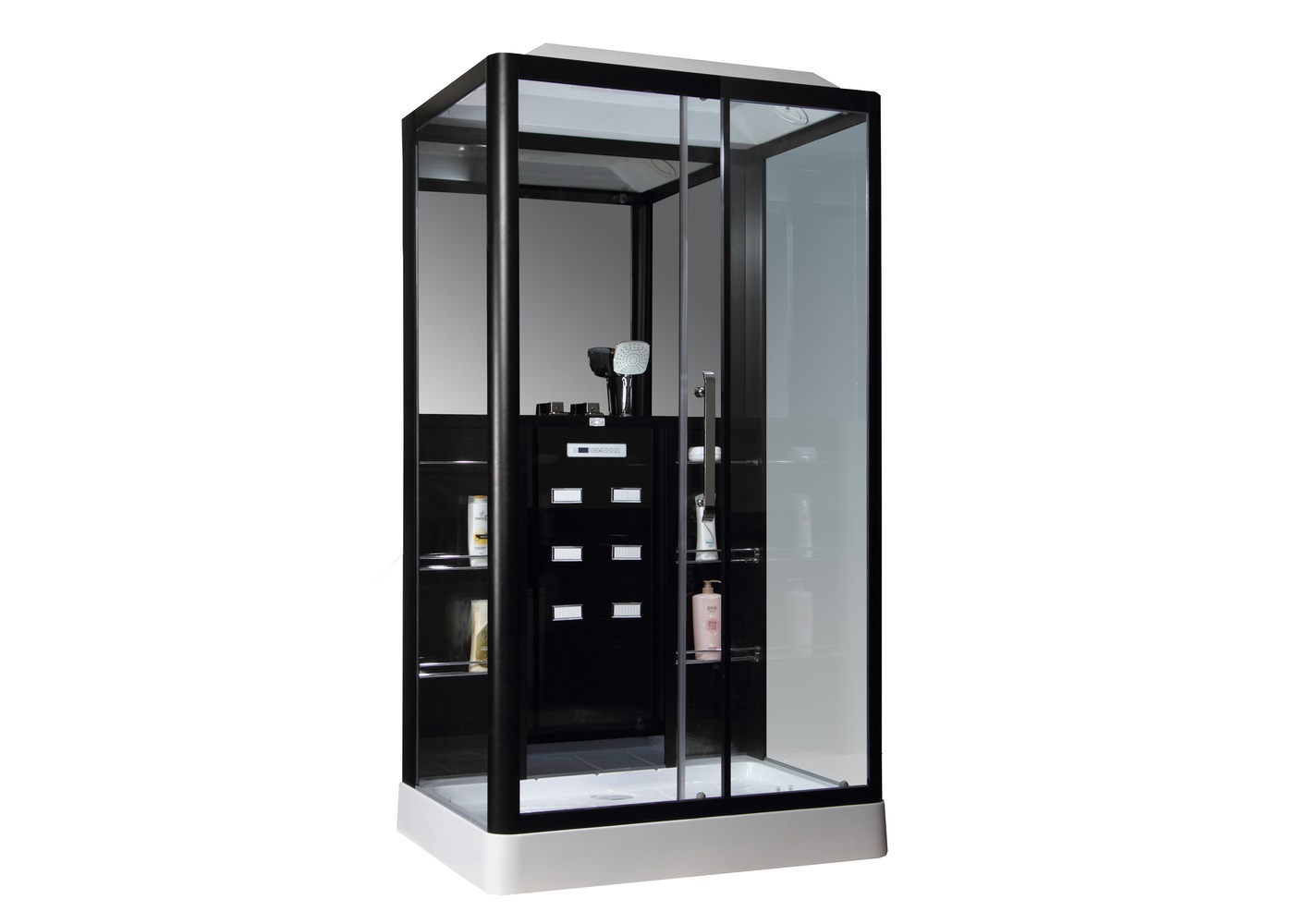 Алюминиевая рама, Закаленное стекло 6мм, управляется сенсорной панелью, радио, вентилятор, светильник, полка, смеситель 3 режимный кран, массаж ног, крыша с верхним душем, ручная лейка.