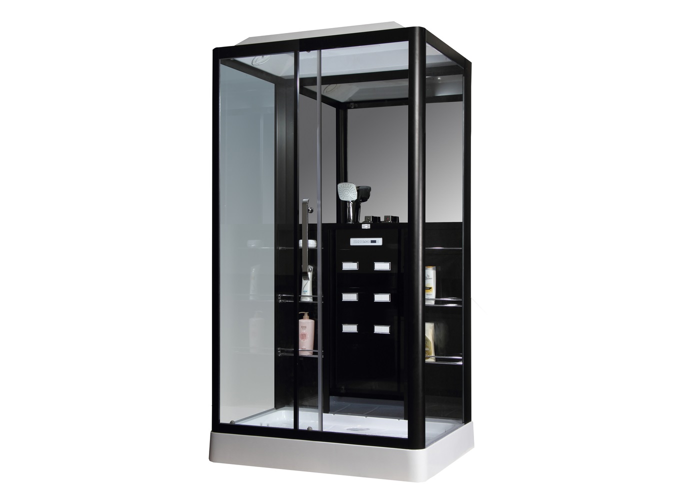Алюминиевая рама, Закаленное стекло 6мм, управляется сенсорной панелью, радио, вентилятор, светильник, полка, смеситель 3 режимный кран, массаж ног, крыша с верхним душем, ручная лейка.