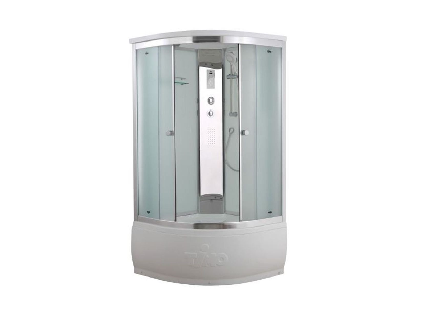 Размеры 1000х1000х2200, высота поддона 480 мм, верхний душ (тропический ливень), декоративная подсветка, встроенный термостатический четырехрежимный смеситель TIMO c переключателем на верхний душ (TROPICAL RAIN), сенсорный пульт нового поколения TsCP с функциями включения/выключения, FM-радио, верхний свет, вентиляция, безопасное напряжение на выходе 12 V, регулируемая по высоте штанга из нержающей стали, центральная панель выполнена из полированной нержавеющей стали.