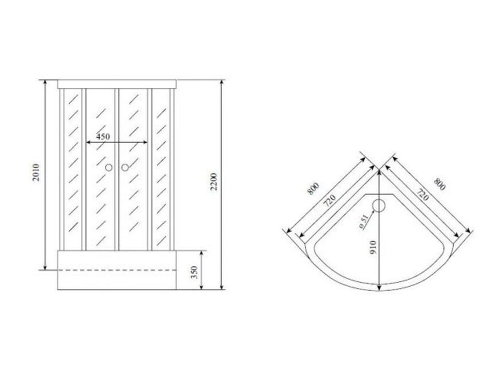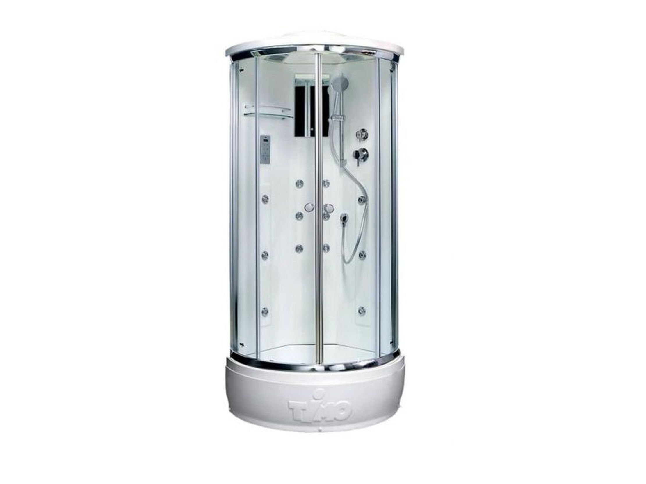 Размеры 800х800х2200, высота поддона 350 мм, прозрачные стекла, верхний душ (тропический ливень), встроенный однорычажный смеситель TIMO с четырехрежимным переключателем на верхний душ (TROPICAL RAIN), хромированный смеситель, сенсорный пульт нового поколения TsCP с функциями включения/выключения, FM-радио, верхний свет, вентиляция, безопасное напряжение на выходе 12 V.