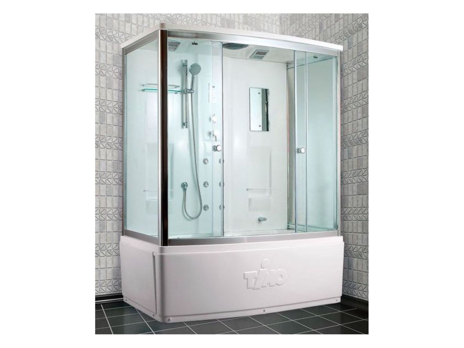 Размеры 1500х900х2200, прозрачные стекла, высота поддона 600 мм, верхний душ (тропический ливень), гидромассажная душевая стойка, однорычажный регулятор температуры, встроенный однорычажный смеситель TIMO с четырехрежимным переключателем на верхний душ (TROPICAL RAIN), стеклянная полочка и диспенсеры для геля и шампуня, радио, верхний свет, сенсорный пульт нового поколения TsCP с функциями включения/выключения, FM-радио, верхняя и боковая подсветка, вентиляция, безопасное напряжение на выходе 12 V.