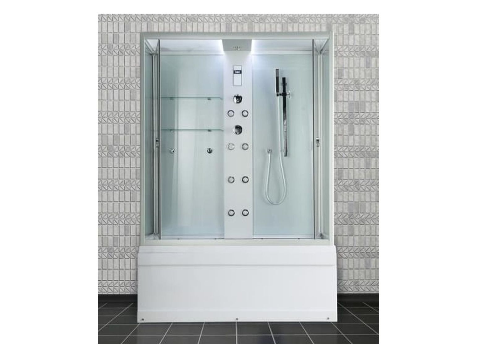 Размеры 1680х900х2200, прозрачные стекла, высота поддона 600 мм, верхний душ (тропический ливень), гидромассажная душевая стойка, встроенный однорычажный смеситель TIMO с четырехрежимным переключателем на верхний душ (TROPICAL RAIN), стеклянные полочки и крючки, радио, верхний свет, сенсорный пульт нового поколения TsCP с функциями включения/выключения, FM-радио, bluetooth, верхняя и боковая подсветка, вентиляция, безопасное напряжение на выходе 12 V.