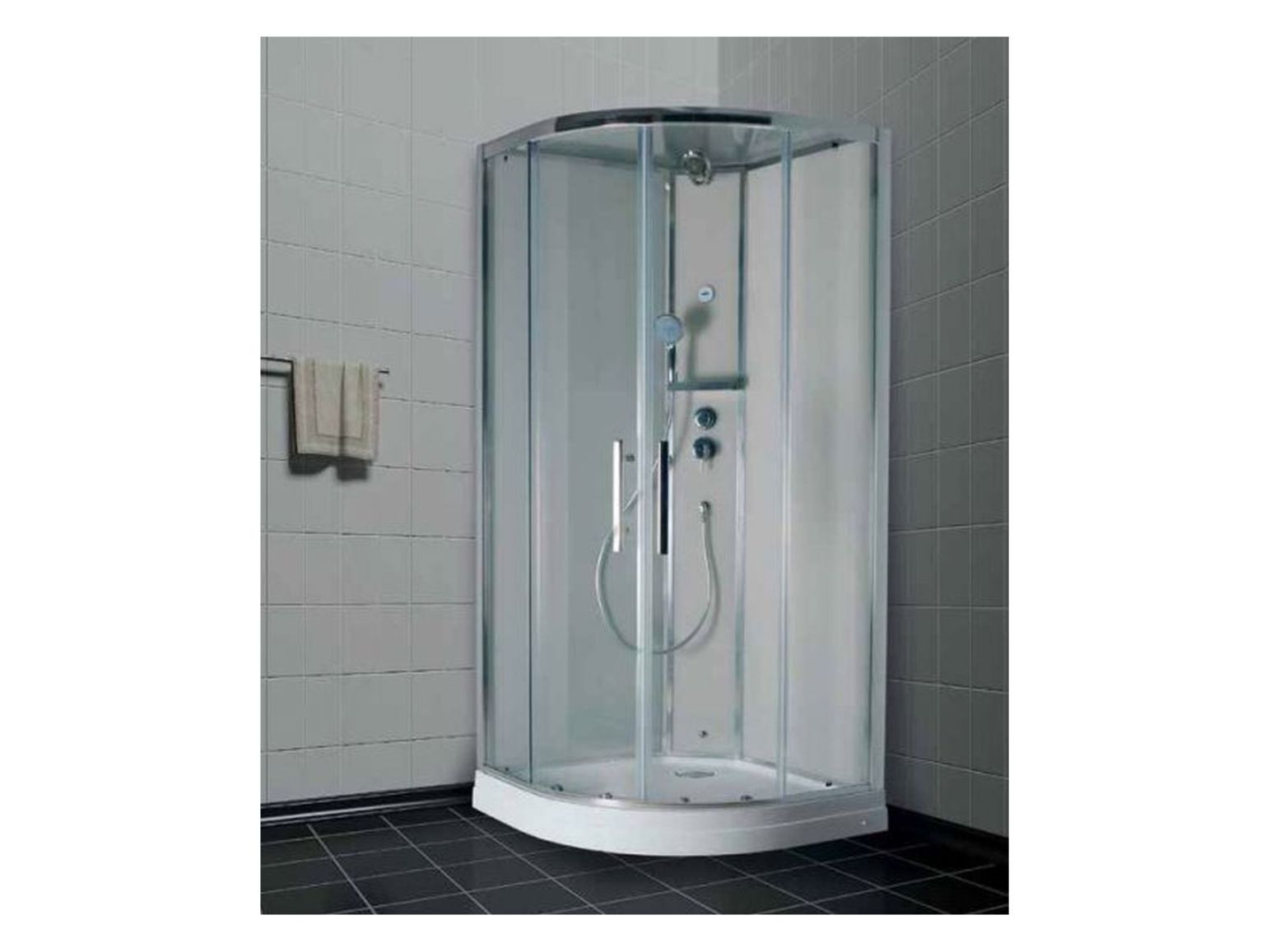 Размеры 1000х1000х2220, прозрачные стекла, высота поддона 180 мм, безсиликоновая сборка, верхний душ (тропический ливень), центральная консоль и тропический душ выполнены из полированной нержавеющей стали, стеклянные задние стенки супербелого оттенка, раздвижные двери толщиной 6 мм, двойные ролики, анодированный, алюминиевый, хромированный профиль, фирменный термостатический смеситель Timo, верхний, боковой тропический душ, душевая массажная лейка, полочка и ручки из нержавеющей стали.