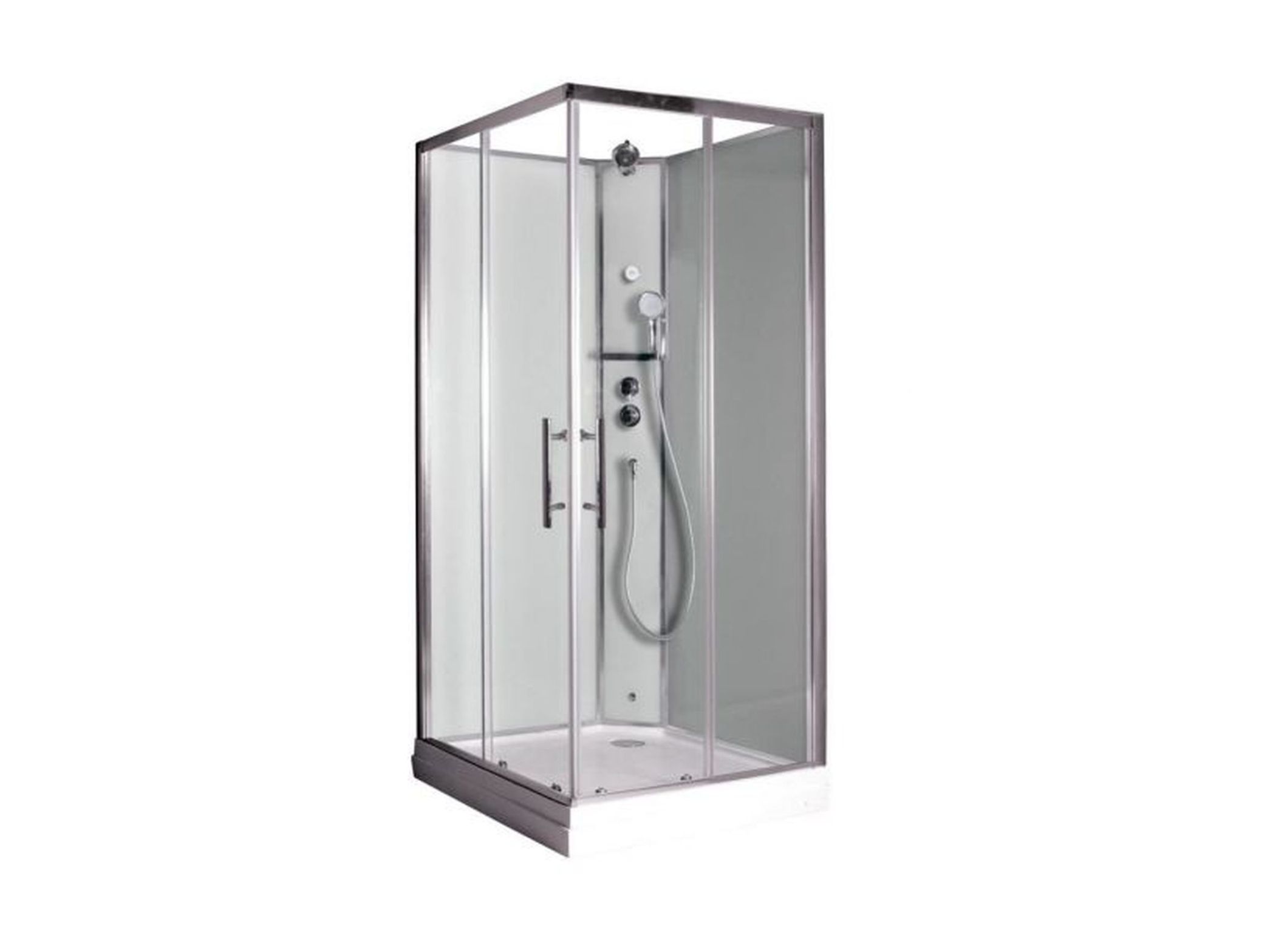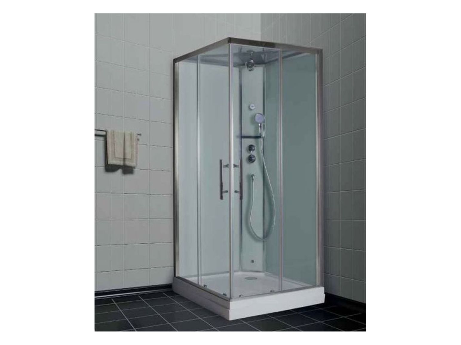 Размеры 1000х1000х2220, прозрачные стекла, высота поддона 18 см, безсиликоновая сборка, верхний душ (тропический ливень), центральная консоль и тропический душ выполнены из полированной нержавеющей стали, стеклянные задние стенки белого оттенка, раздвижные двери толщиной 6 мм, двойные ролики, матовый хромированный профиль, фирменный термостатический смеситель Timo, верхний, боковой тропический душ, душевая массажная лейка, полочка и ручки из нержавеющей стали.