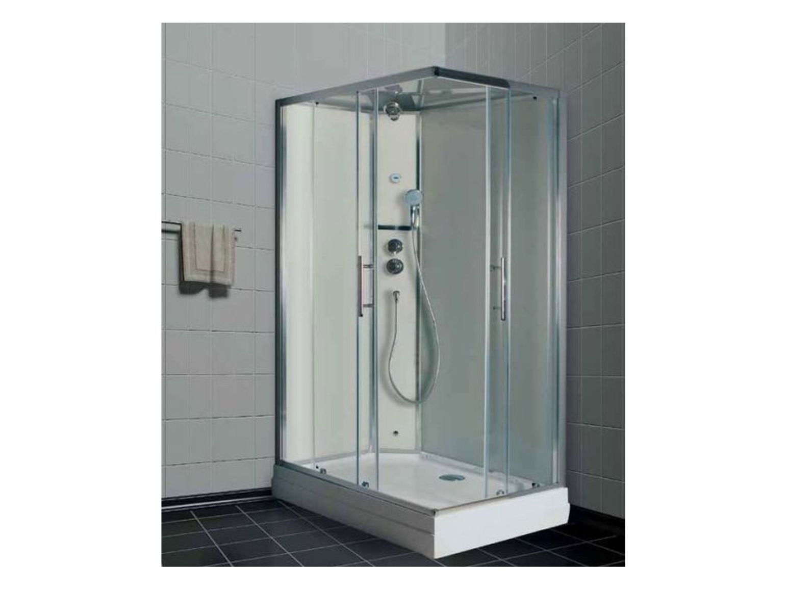 Размеры 1200х800х2220, прозрачные стекла, высота поддона 18 см, безсиликоновая сборка, верхний душ (тропический ливень), центральная консоль и тропический душ выполнены из полированной нержавеющей стали, стеклянные задние стенки белого оттенка, раздвижные двери толщиной 6 мм, двойные ролики, матовый хромированный профиль, фирменный термостатический смеситель Timo, верхний, боковой тропический душ, душевая массажная лейка, полочка и ручки из нержавеющей стали.