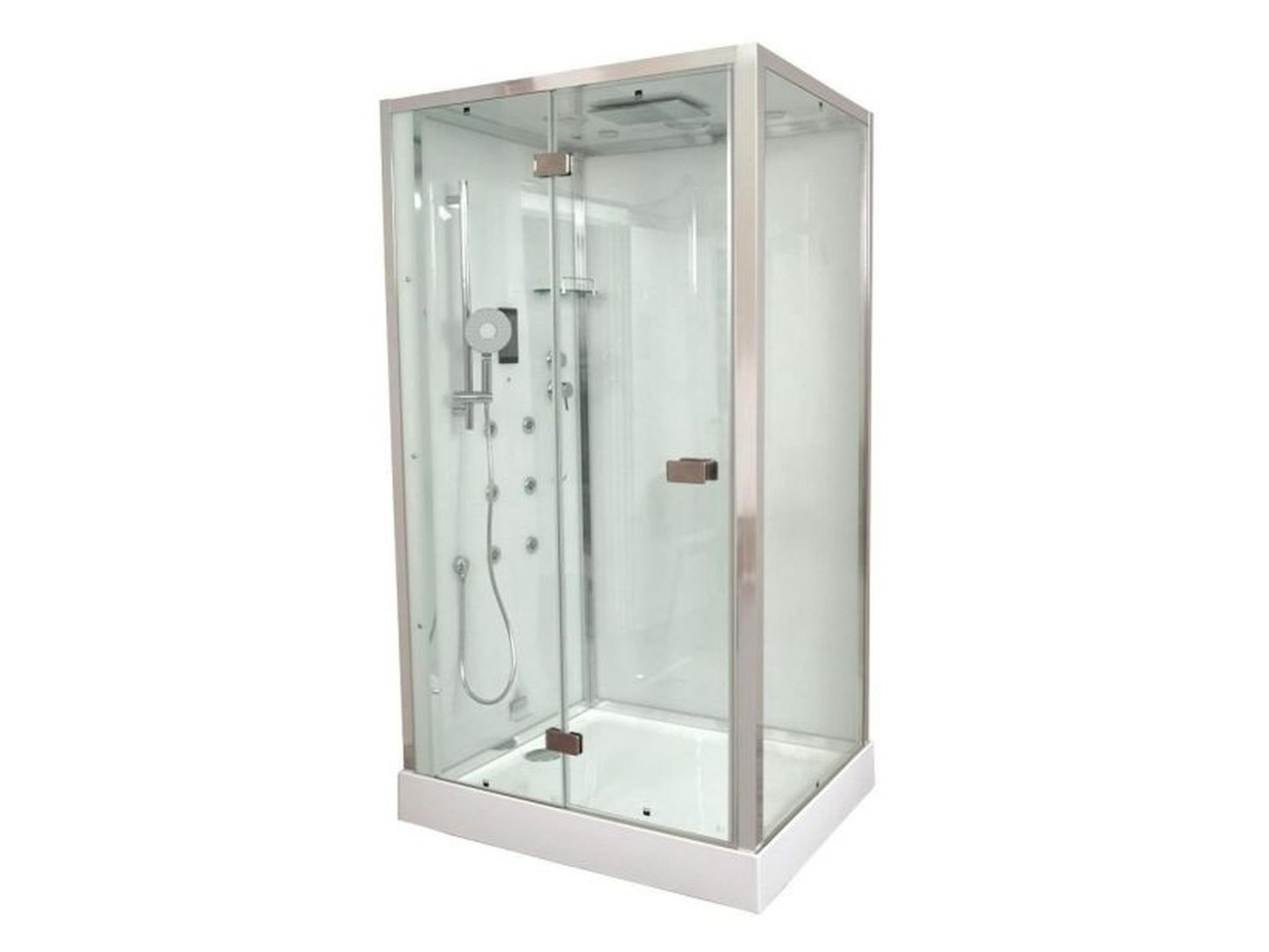 Размеры 1200х900х2200, прозрачные стекла, высота поддона 150 мм, верхний душ (тропический ливень), современный сенсорный пульт управления, турецкая баня, аромотерапия, раздвижные двери на роликах (левосторонние и правосторонние), FM-радио, вентиляция, безопасное напряжение на выходе 12 V.
