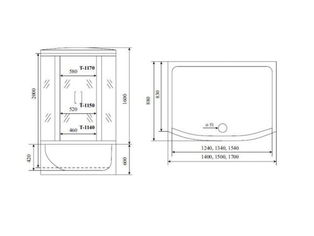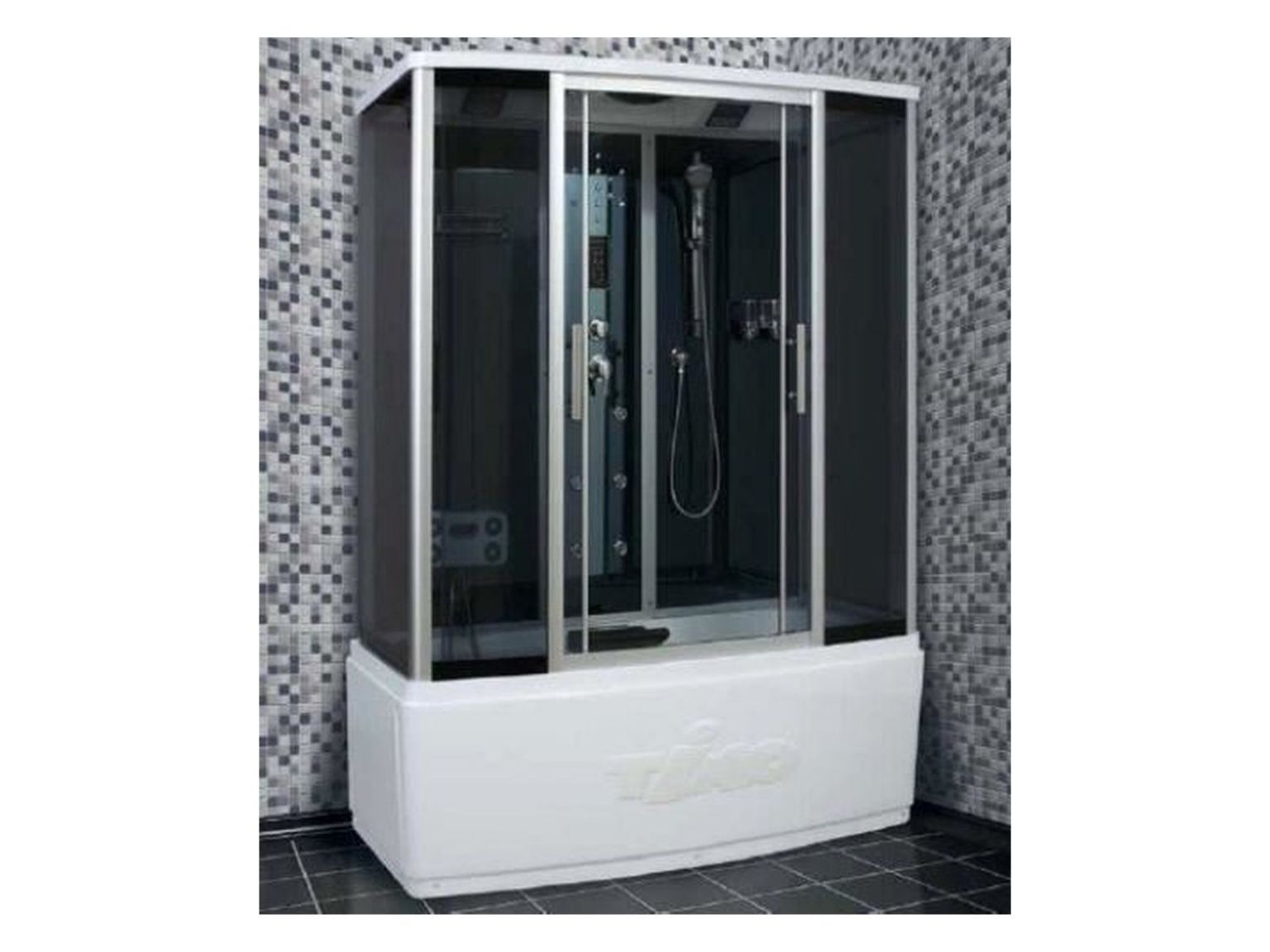 Размеры 1700х880х2200, тонированные стекла, высота поддона 600 мм, верхний душ (тропический ливень), гидромассажная душевая стойка, однорычажный регулятор температуры, встроенный однорычажный смеситель TIMO с четырехрежимным переключателем на верхний душ (TROPICAL RAIN), стеклянная полочка и диспенсер для геля и шампуня, радио, верхний свет, сенсорный пульт нового поколения TsCP с функциями включения/выключения, FM-радио, верхняя и боковая подсветка, вентиляция, безопасное напряжение на выходе 12 V.