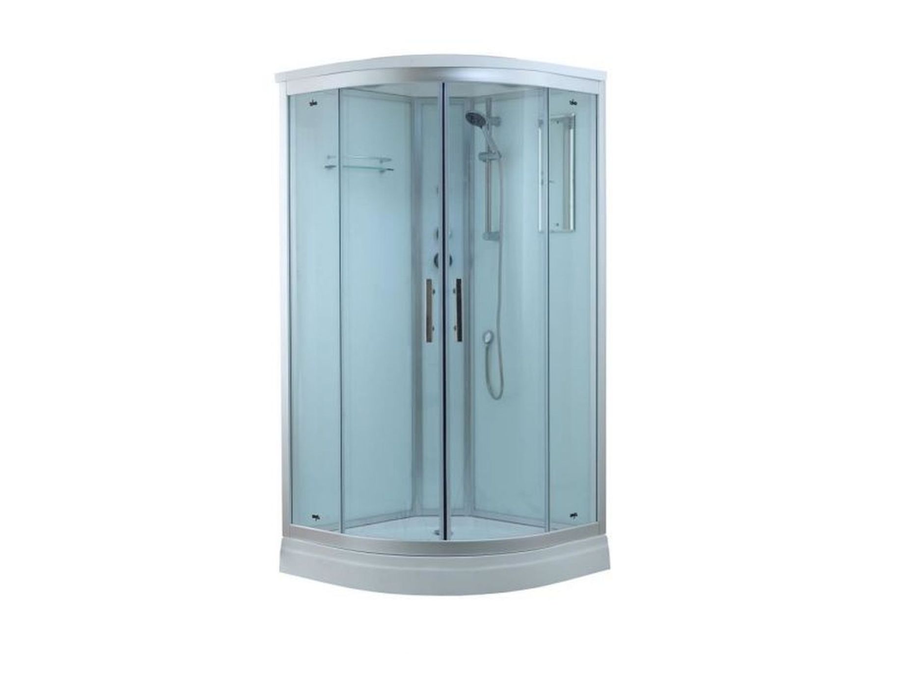Размеры 900х900х2200, высота поддона 150 мм, верхний душ (тропический ливень), встроенный однорычажный смеситель TIMO с двухредимным переключателем на верхний душ (TROPICAL RAIN), безопасное напряжение на выходе 12 V.
