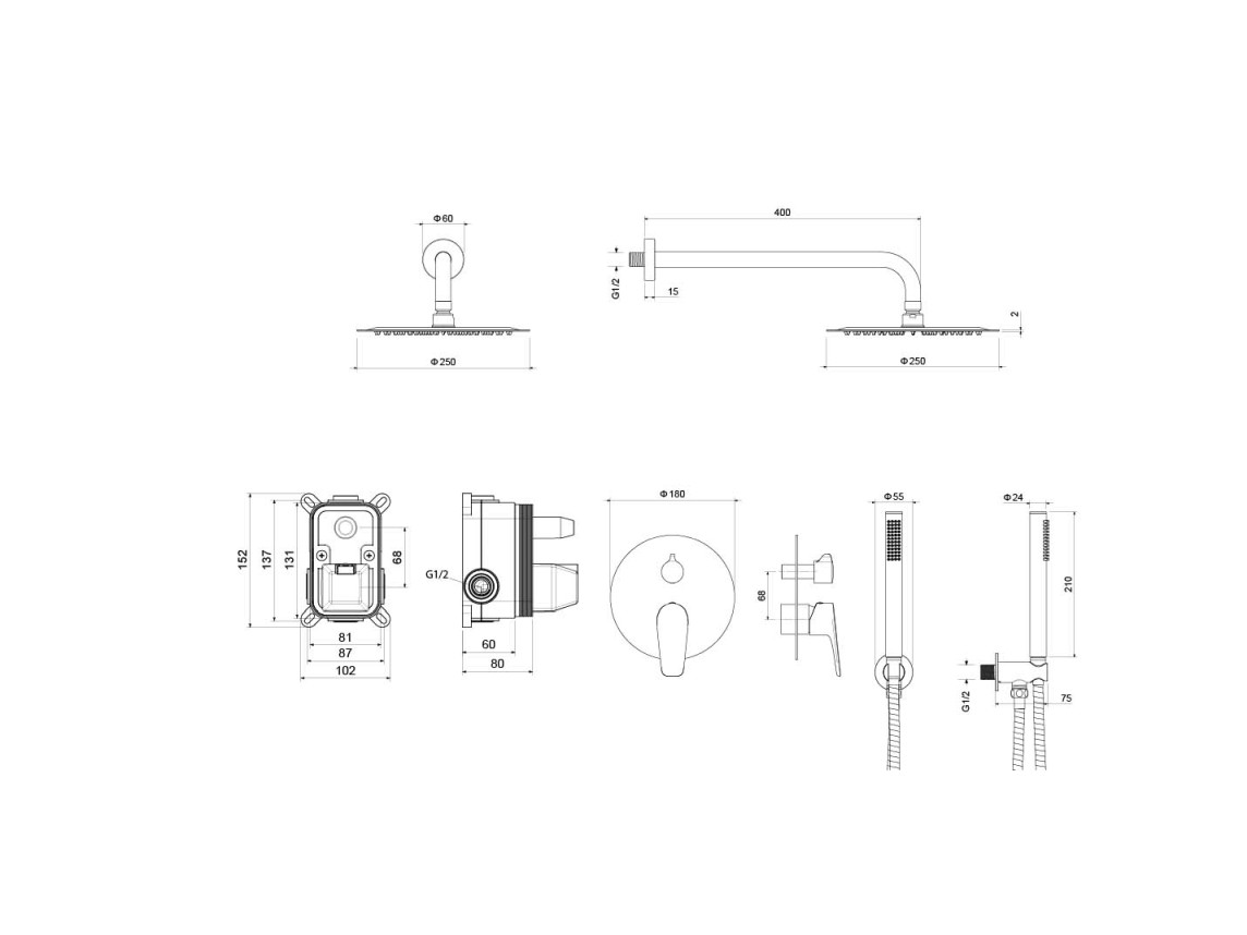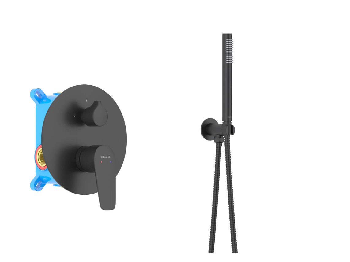 • Душевой гарнитур: лейка, шланг, шланговое подсоединение с держателем
