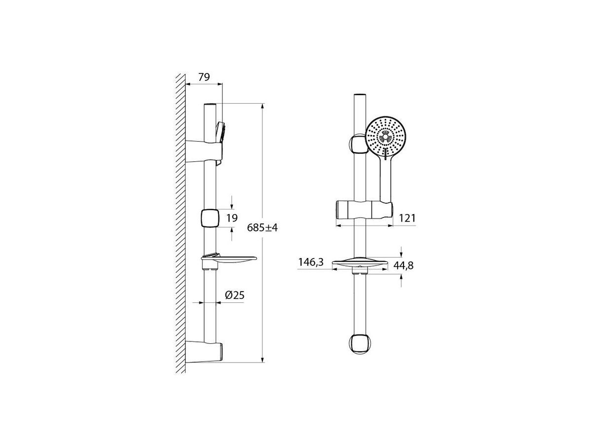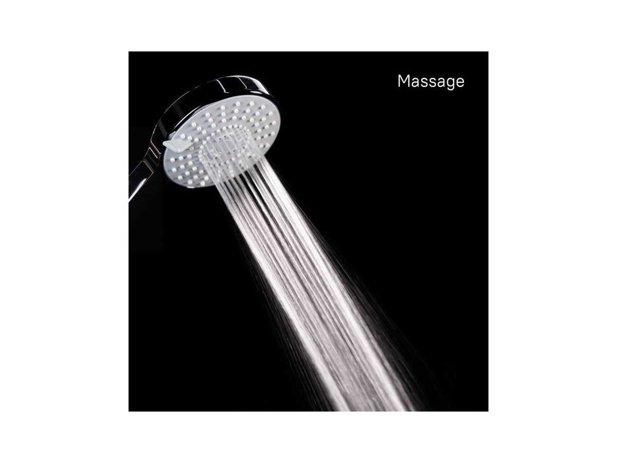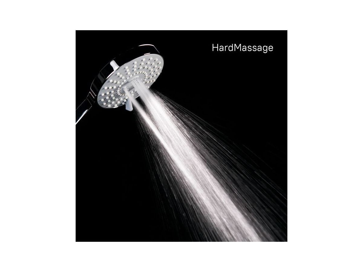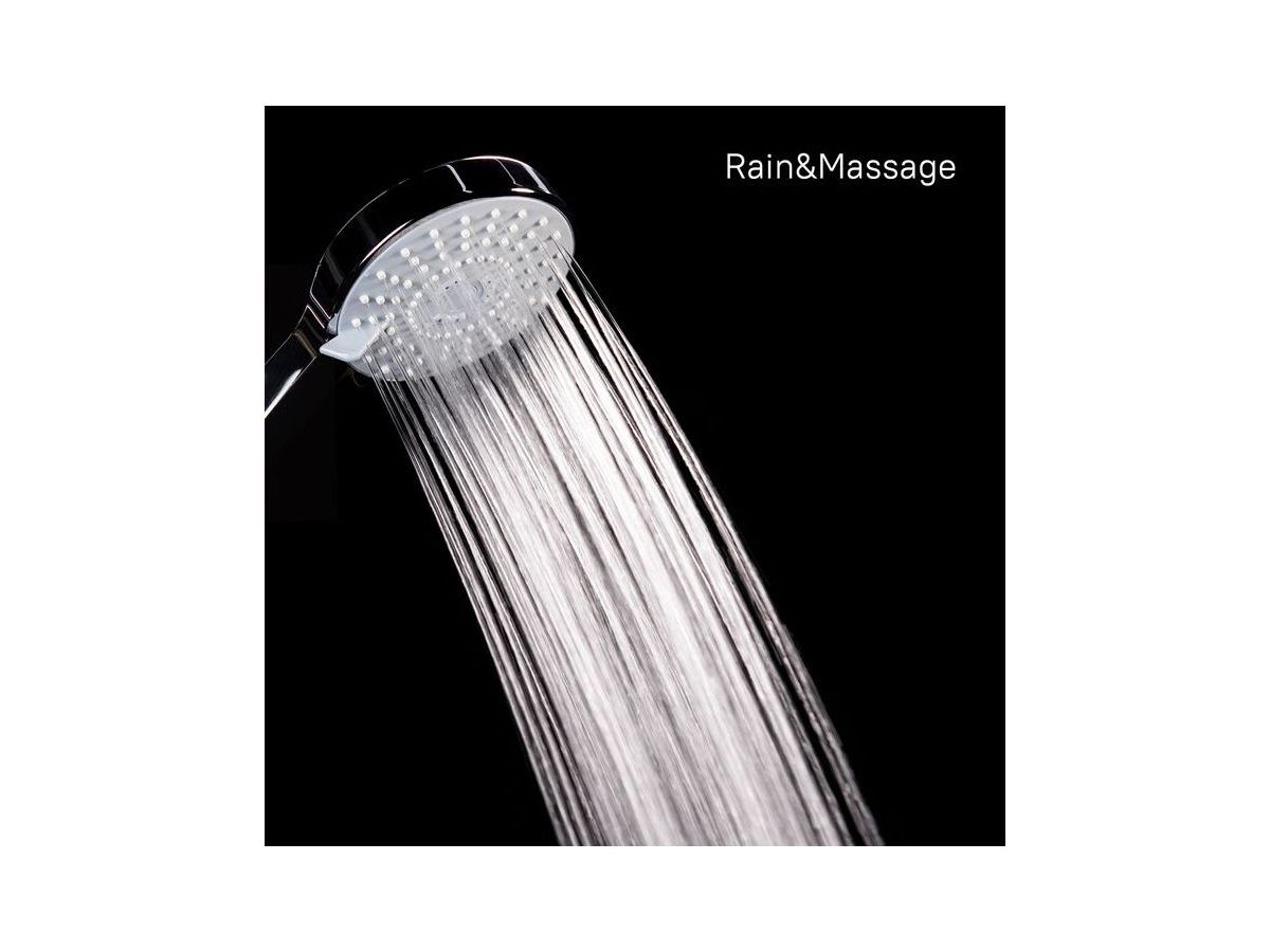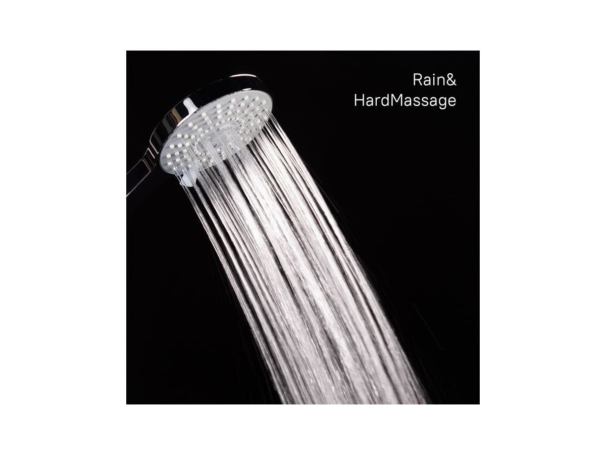 Душевой гарнитур. Лейка с 5 режимами (Rain, Massage, Rain&Massage, Hard massage, Hard massage&Rain), диаметр 108 мм. Верхнее крепление стойки регулируется по высоте. Шланг: нержавеющая сталь, 1,5 метра, с cистемами Twist-Free и Double Lock. Высота стойки: 685 мм. В комплекте: мыльница. кольцо для фиксации шланга, крепеж.