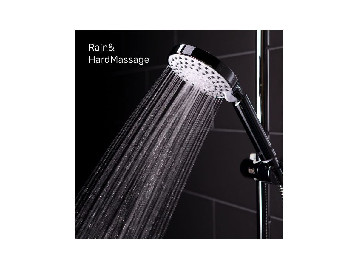 Душевой гарнитур с верхней лейкой. Ручная лейка с 5 режимами (Rain, Massage, Rain&Massage, Hard Massage, Rain&Hard Massage). Стойка: нержавеющая. Диаметр леек: верхняя 250 мм, ручная лейка - 118 мм, материал леек: ABS-пластик. Шланги: нержавеющая сталь, 1,5 и 0,6 метра, с системами Double Lock и Twist-Free. Поворотный керамический дивертор: три режима (переключалель верхний душ/ручная лейка/комбо-режим). Верхнее крепление стойки свободное. Телескопическая стойка, высота 860-1223 мм. Шарнирное крепление верхней лейки регулирует направление потока под нужным углом. В комплекте: вместительная полка из высокопрочного ABS-пластика, крепеж.